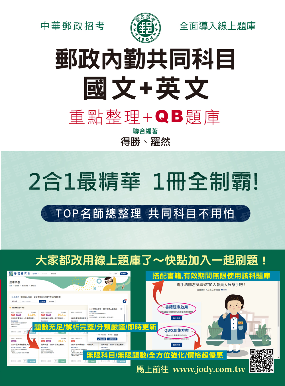 最佳賣點 : ★此為滿足廣大「準備時間有限」考生之需求,特邀各科專業作者與編輯群攜手為考生量身訂作:全書內容經過去蕪存菁後,只留下「最精華命題焦點」輔以題目最多,功能最強之「QB線上題庫」;配合實際考科「二合一」設計,幫考生省下做總整理的時間,讓您有機會透過短時間的密集衝刺,在郵政招考第一階段筆試中脫穎而出。★