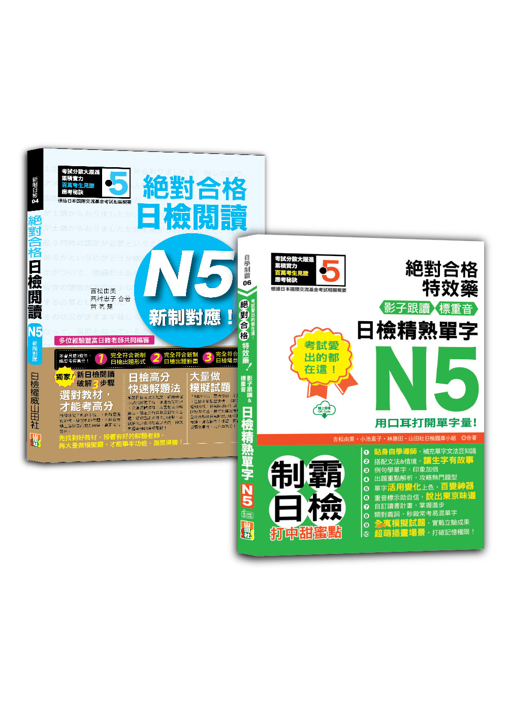 商品描述 | 日檢閱讀及精熟單字N5秒殺爆款套書 (2冊合售):《新制對應!絕對合格日檢閱讀N5(25K)》2012年8月出版 ★獨家特色★1.選對教材,才能考得高分。 持續地做「對的事情 |