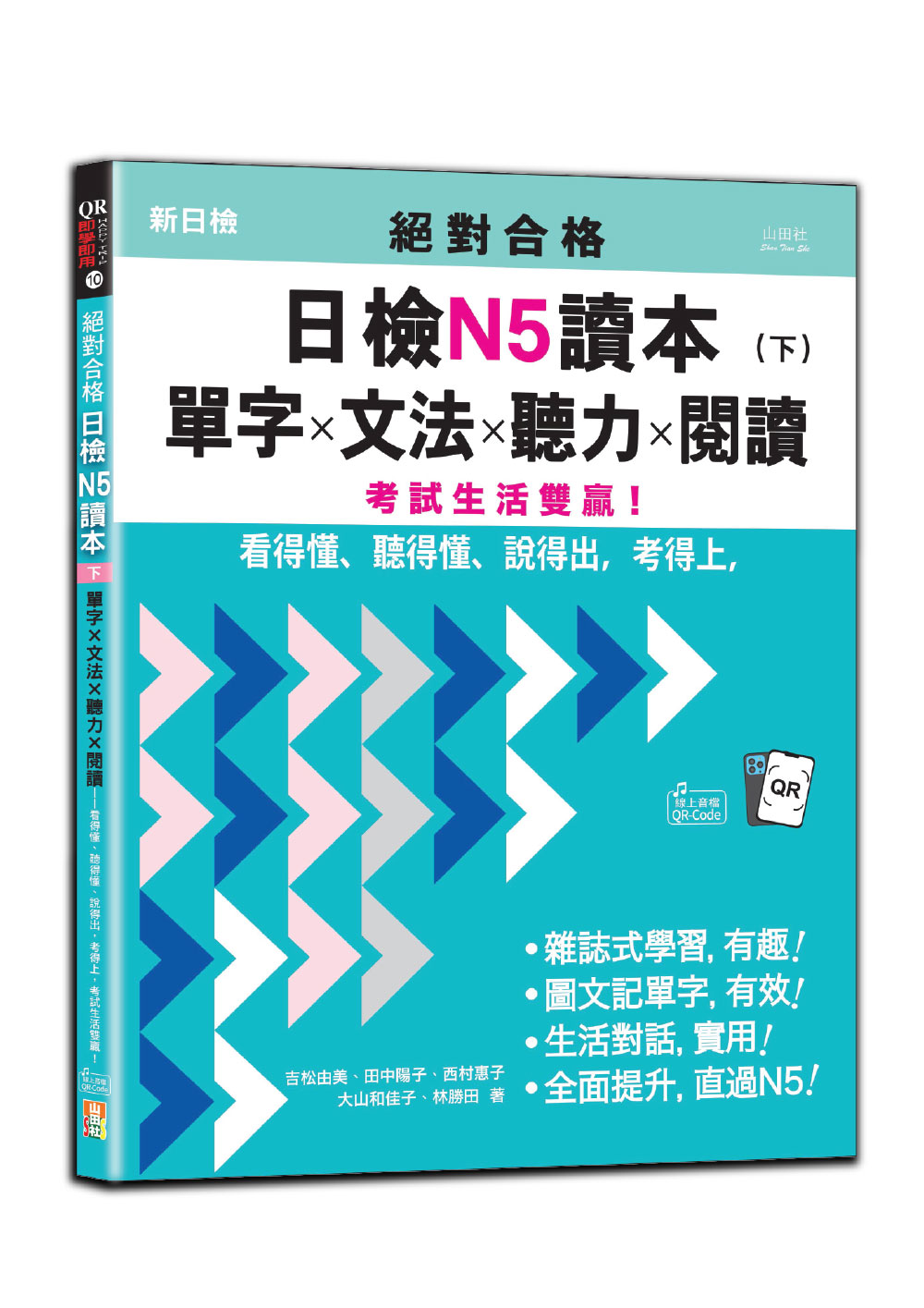 書名 / | 絕對合格日檢N5讀本 下: 單字×文法×聽力×閱讀, 看得懂、聽得懂、說得出, 考得上, 考試生活雙贏! (附QR Code) |