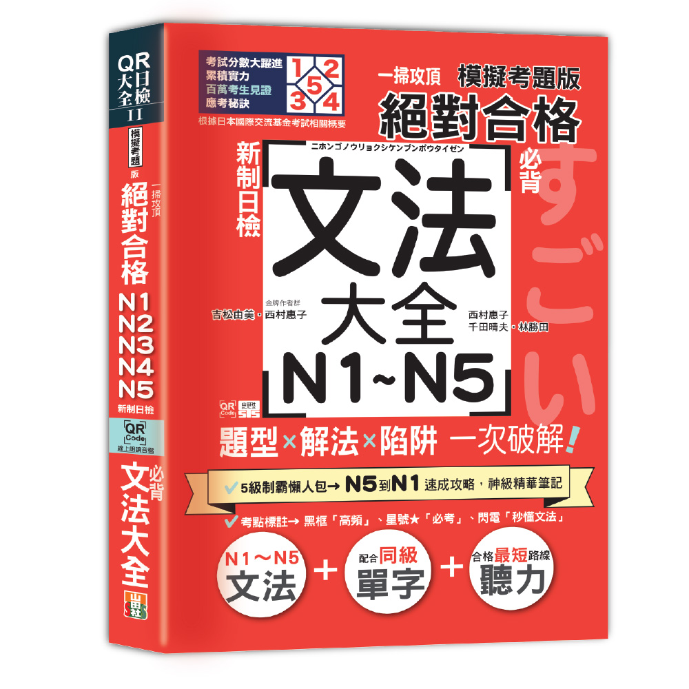 書名 / | 新制日檢! 絕對合格N1.N2.N3.N4.N5必背文法大全 (模擬考題版 附QR Code) |