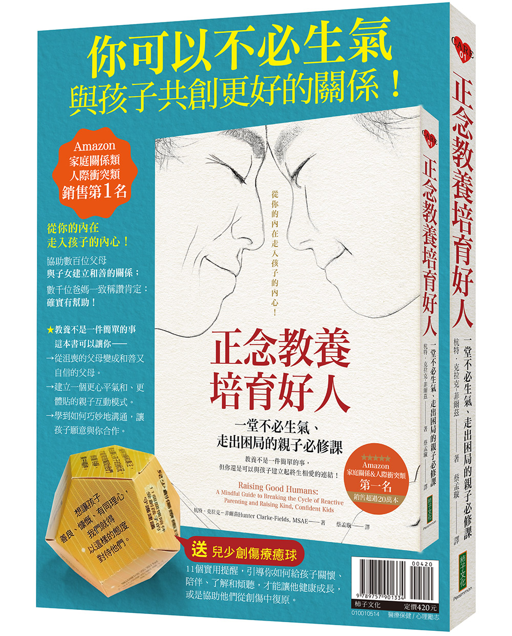 各界推薦 【掛名推薦】黃之盈 心理諮商師魏瑋志(澤爸) 親職教育講師【國內名人推薦】我很喜歡《正念教養培育好人》的內容編排,把父母最大困境的「情緒反應循環」放在第一單元,讓閱讀這本書的每個父母知道,大吼大叫、爆雷根本於事無補,而且完美父母不存在。第二單元,才說明如何教養出和善自信的孩子。這讓我了解,教養的根本是在認識自己。《正念教養培育好人》幫我再次溫習了正念減壓MBSR的重點,書中把當代正念經典練習:吃葡萄乾、正念靜坐、慈心祝福、如實如是觀察等運用在教養中。並且,每個章名頁中的「大手牽小手」(或小手牽大手)的圖片,溫暖顯示了我們與孩子的教養關係,正是一種互動與平等的關係。這本書適合一般大眾、父母親職角色來閱讀,我們可以透過本書來療癒小時候的自己,認識自己,療癒自己,陪伴孩子!——李怡如Sangeeta 正念減壓MBSR與正念瑜珈老師,桑吉塔正念瑜珈與靜心空間創辦人做對選擇比努力更重要,不少父母都非常「努力」想教好孩子,讓他們出人頭地,成為社會上有用的人。但不知為何,總是在怒氣挫折中百思不得其解。究竟孩子該怎麼教?到底孩子為什麼總是頂嘴?又,孩子已經網路成癮了,該怎麼辦啊?「做對選擇」就有機會改變親子關係。《正念教養培育好人》作者杭特.克拉克–菲爾茲學有專精,將感人實例和實用演練提供給所有的父母們。我們只要按照這些練習題一點一滴地去修正過往不當的教養方式,就能「做對選擇、用對方法」,來改善親子關係。一切都來得及!我們大人先修正,孩子就跟著調整了。——吳娟瑜 國際演說家暨親子教育專家教養不是數學題,沒有標準答案!本書的英文原名為Raising Good Humans,其實正是在提醒讀者:教養,不求正確與否。我們只求在養育孩子的路上,能帶出「良善人格的孩子」,培育他們以全人格之姿邁向社會,那便是恰恰好的教養法則。全人格的教養,也是父母在陪伴孩子路上,對自我整體的「全人照顧」,平衡大腦、身體與情緒三方。爸媽把自己照顧好了,自然能帶出穩定人格的孩子。推薦這本《正念教養培育好人》,它提醒了父母們在教養上的不二法則:自己穩了,自然能教養孩子成為良善之人(good humans)。——李家雯(海蒂) 諮商心理師、《教養是合作》作者、兩個孩子的媽這是一本非常有意思的書,不論你的孩子現在幾歲,都可以從這本書中獲得一些啟發。書中不斷告訴我們「你練習什麼,什麼就會變得強大」。換言之,爸媽必須自己先活出希望小孩的樣子,而這是可以練習的,這其中包括:如何面對情緒、如何照顧好自己、如何滿足自己的需求等。教養的問題總是千頭萬緒,爸媽如果能勇敢看到纏繞的線頭是在自己身上,而不在孩子身上,會少走很多荊棘暗路。這是一本強調實踐的書,如果你快速瀏覽過,記得回頭親自嘗試看看書中的方法,但別衝快,真正的學習都需要時間消化與內化。這個年代的教養,非常、非常不容易,當爸或媽的你,要常常為自己或彼此加油打氣喔!——胡君梅 華人正念減壓中心創辦人此書提供了教養孩子不可或缺的觀念、訓練與實用技能,值得每一位面對教養工作的父母仔細閱讀,對於正念學習者而言,此書也是了解如何將正念融入教養工作不可或缺的好書。教養孩子的工作本是一趟自我修行的旅程。最重要的事,是記得最重要的事。作者一開始便指出養育小孩最重要、卻也最常被遺忘的核心觀念:父母想要孩子成為什麼樣子,自己在生活中,尤其在面對小孩時,就應該是那個樣子。以身作則的身教,是所有教育中最核心的事。 ——溫宗堃 臺灣正念發展協會榮譽理事長【國外名人推薦】《正念教養培育好人》一書為正念教養的主題帶來散發智慧與清新的風貌。作者杭特.克拉克-菲爾茲(Hunter Clarke-Fields)汲取自身教養經驗裡的挑戰與難題,概述如何跳脫「不夠好」這個老套的故事所需要的關鍵技巧,藉此建立一個更有愛心、相互合作的和諧家庭關係。──塔拉.布萊克(Tara Brach, PhD),著有《全然接受這樣的我》(Radical Acceptance)父母若想為孩子灌輸自信、心理健康與獨立概念,同時又與他們建立一個穩固持久的親子關係,《正念教養培育好人》正是你需要的指南書。本書作者已經幫助許多家庭處理各式各樣的問題,她的文字間洋溢著疼惜心,論述清晰、句句箴言,囊括了豐富精彩的洞見、策略與練習,幫助讀者成為一個更能夠保持正念的父母。杭特.卡拉克-菲爾德是一位極具說服力的倡導者,主張讓靜心在我們與孩子的生活中發揮強大的力量。她的著作能讓你的生活變得更美好──只要你願意擁抱這趟旅程。這是我讀過最棒的教養書之一!──凱瑟琳.雷諾.李維斯(Katherine Reynolds Lewis),著有《壞行為的好消息》(The Good News About Bad Behavior)這是一份坦率又充滿愛的地圖,教導父母如何巧妙地度過充滿挑戰的時刻,同時深化自己與孩子之間共享的喜悅、連結與愛。──蕭納.莎碧洛(Shauna Shapiro, PhD),聖塔克萊拉大學(Santa Clara University)心理系教授,著有《早安,我愛你》(Good Morning, I Love You)杭特.克拉克-菲爾茲真的明白,若要養育出心目中的孩子,我們必須成為自己心目中的人,但這兩個目標是一段旅程,而非只是目的地。這部精彩的作品能協助你面對這趟旅程。──KJ.戴爾安東尼亞(KJ Dell’Antonia),著有《如何做個更快樂的父母》(How to Be a Happier Parent),曾任《紐約時報》M