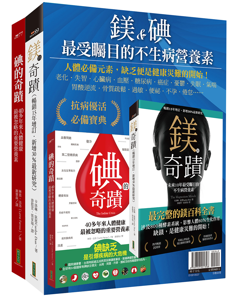各界推薦 《鎂的奇蹟》鎂是人體不可或缺的礦物質之一,也是我們所必需攝取的營養素當中,最容易被忽略的一個。人體無法製造鎂,必須從食物中攝取,比較可惜的是,由於食物來源、生活習慣和藥物等因素,讓我們比過去更容易缺鎂卻不自知。人體健康需要各種營養素共同發揮作用,《鎂的奇蹟》被譽為「鎂的百科全書」,但本書的用意並不在於告訴大家補鎂治百病,而是過去以來,太多人因為資訊不足而忽視鎂對人體的重要性,所以作者引用許多可信的科學研究,提供鎂對於健康的多方面影響,以及缺鎂可能導致哪些症狀或疾病,提醒我們讓身體適當具備鎂這種營養素,以維持平衡和健康。雖然作者在書中比較推薦她所研發的鎂補充品(ReMag),但我們不必強求,透過飲食和其他口服鎂補充品,有必要時,再搭配鎂鹽泡澡、鎂油等透過皮膚吸收鎂,一樣有助於我們適當的補充鎂,進而擁抱健康的身體並提升生活的品質。──王銘富日本德島大學醫學部營養學碩士、保健學博士;靜宜大學食品營養學系講座教授;台灣鎂營養素協會常務理事鎂是人體需要的重要元素,但許多人需要它卻不自知。事實上,許多健康問題都和國人普遍攝取鎂不足有關,根據這幾年的觀察,大家普遍對於鎂的認知不夠,通常侷限於抽筋的預防和維持肌肉骨骼的健康,個人深感需要推廣與介紹!科學貴在實證與資訊的更新,新版《鎂的奇蹟》,更新了關於「鎂」的科學證據,進一步分享了缺鎂可能造成的健康問題,進一步給讀者們更多且多面向的健康知識,使得這本擁有鎂的百科全書美譽的經典之作,更顯當之無愧! ──張鈞程生技公司總監&藥師在四大電解質――鈉、鉀、鈣、鎂――裡面,鉀跟鎂大概是最被忽略的。一般人通常都知道且最常補的是鈣,但其實鈣是最不需要補的,再加因為不曬太陽而導致維生素D不足,使得鈣無法去到該去的地方,而鈣又與鎂拮抗,結果鎂的缺乏就更嚴重了。鎂參與身體的八百多種生理反應,過多植酸攝取還會導致礦物質缺乏,一旦缺鎂,身體很多機能都會減慢或是關閉。許多人在補足鎂之後,身體的問題都不藥而癒了,《鎂的奇蹟》是國內關於鎂知識當中,數一數二的著作,絕對值得你收藏。──陳世修(Martyn)健身教練、《生酮哪有那麼難!》作者優秀的研究與極具價值的啟發!──約書亞.羅森塔綜合營養學校主任、《能量平衡的飲食》作者這是一本極具啟發性的實用書!狄恩博士提供我們強而有力的資訊,提醒我們應該注意這個十分重要卻經常被忽略的「礦物仙丹」。每個人都應該要好好讀一下《鎂的奇蹟》,它能讓我們擁有營養且健康的生活。──尤金.查爾斯國際應用筋肉學會認證按摩脊椎治療醫生&《治癒你的病人》作者我投身整合醫療已經三十年了,我相信自己對鎂相當了解──直到我讀到卡洛琳醫師的最新著作。這本書絕對是我所讀過,針對鎂這個議題最全面的調查。《鎂的奇蹟》受到醫生和病人的一致好評,它將能為人類帶來極大的幫助,書中不藏私的分享了許多未能被列入醫學課程中的重要鎂知識。 ──賽拉菲娜.科塞羅醫學博士&《不老的療癒》作者透過《鎂的奇蹟》,卡洛琳.狄恩博士為我們提出最棒的證據,指出隱身在疾病背後的缺鎂症,是造成大多數人的病痛的主因。每個希望提升他們生活品質的人,都需要好好閱讀這本書。──史帝芬.T.辛納屈醫學博士&《辛納屈解方:代謝心臟病》作者一本關於鎂的無數好處,全面而絕佳的參考指南。──卡羅琳.德馬科醫學博士&《對自己的身體負責:婦女健康建議》作者幾乎每一個人都能從這本書受益!──保羅.派區福特《全食物療癒:亞洲傳統和現代營養學》作者醫生和治療師很少注意到的重要元素──鎂,其實和我們的身體健康息息相關,你想知道的證據幾乎都在這本關於鎂的重要著作了。我很高興自己已經服用鎂這麼多年!──亞伯拉罕‧霍夫醫學博士&《全部都放在一起吧:新分子營養學》作者--------------------------------《碘的奇蹟》本書帶給我一些關於碘的新知,原來女性的生殖器官與男性的攝護腺也都含比較高濃度的碘,這些碘一定有它的作用,也再再說明為何葛森醫師發現碘在治療癌症上很好用。一路研究以來,碘真的給我很多健康啟示,所以平常我的急救百寶箱裡一定有一瓶碘劑,有時旅行會加碘到飲用水殺菌防腹瀉,或加到洗生菜沙拉水中預防感染。非常感謝作者寫了這本寶貴的書,告訴大家她自己的研究發現與體驗,我十分樂意推薦這本書給讀者,也請愛好自然健康的讀者多多有親友分享這本好書。──陳立川,中華民國能量醫學學會理事長我在門診會告訴一般無甲狀腺亢進的病人生病時要補充碘,也直接幫喉嚨痛病人塗抹或噴碘劑,除了攝取海鮮、海藻食物外,烹飪使用碘鹽,並噴碘仿甘油製劑,但常常得到病人的疑惑:碘吃太多不是會造成甲狀腺機能亢進?沒有副作用嗎?但絕大多數病人回診後的反饋都是正面的!這是我多年看診的累積經驗,雖然有很多重金屬元素是有毒性的,但是有很多的生理金屬卻需要經常補充的,碘就是其中之一,對身體金屬多一點知識,對身體健康自然多一層保護,本書作者並非醫師,可以寫出這麼精彩而有創新見解的書,值得尊敬和推薦,與大家共勉之。──羅仕寬醫師,吉康耳鼻喉科暨整合醫學診所院長、《咳嗽警報》作者每一個人的書架上都應該有這樣一本書,它可以幫助你和