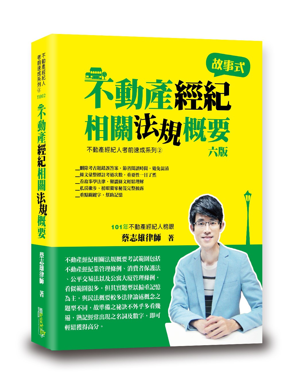 作者介紹 作者簡介蔡志雄律師律師高考及格,不動產經紀人考試全國第二名,全國律師聯合會不動產委員會第二屆主任委員,不動產仲介經紀業營保基金委員,基隆律師公會前理事長,新北市優秀社會青年,RED612揪安心租屋公司董事長,台北市租賃住宅服務公會理事,經常應政府機關及企業邀請演講,曾參與 『地球黃金線』、『News金探號』、『錢線百分百』、『57新聞王』、『全能事務所』、『國會最前線』、『新聞挖挖哇』、『單身行不行』等電視節目討論婚姻法律及不動產,並接受雜誌及各大新聞台採訪。授課產業包含微星科技、中華網龍、聚陽紡織、新光人壽、二信中學、台北市政府青年職涯發展中心、今周刊「理財商學院」、Smart「盤後同學會」、理周教育基金會、板橋區公所、新莊區公所、新北市婦女中心、台中市屯區藝文中心、文化大學推廣部、清華大學自強基金會、青創總會、台灣不動產訓練發展協會、永慶房屋、有巢氏房屋、台慶房屋、住商房屋、中信房屋、21世紀房屋等。近期著有「逢考必中:海邊小孩變全國榜眼的考試必勝法!金牌律師小考大考都在用的高分寶典」。 歡迎加入「蔡志雄律師不動產經紀人榜眼上榜討論區」,一起討論~