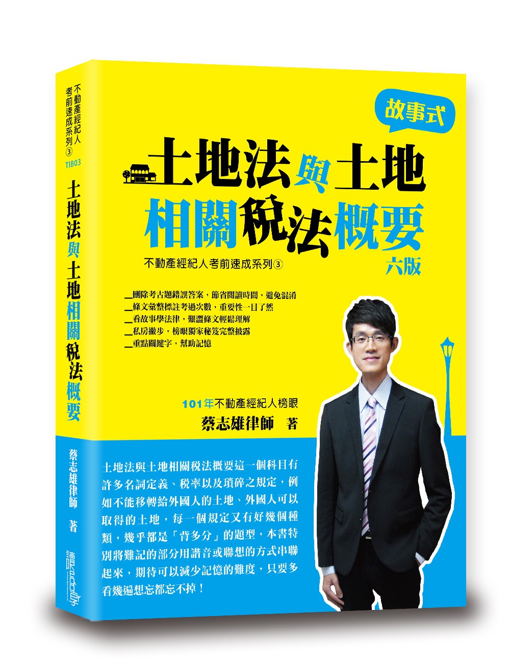 作者介紹 【作者簡介】蔡志雄律師律師高考及格,不動產經紀人考試全國第二名,全國律師聯合會不動產委員會第二屆主任委員,不動產仲介經紀業營保基金委員,基隆律師公會前理事長,新北市優秀社會青年,RED612揪安心租屋公司董事長,台北市租賃住宅服務公會理事,經常應政府機關及企業邀請演講,曾參與 『地球黃金線』、『News金探號』、『錢線百分百』、『57新聞王』、『全能事務所』、『國會最前線』、『新聞挖挖哇』、『單身行不行』等電視節目討論婚姻法律及不動產,並接受雜誌及各大新聞台採訪。授課產業包含微星科技、中華網龍、聚陽紡織、新光人壽、二信中學、台北市政府青年職涯發展中心、今周刊「理財商學院」、Smart「盤後同學會」、理周教育基金會、板橋區公所、新莊區公所、新北市婦女中心、台中市屯區藝文中心、文化大學推廣部、清華大學自強基金會、青創總會、台灣不動產訓練發展協會、永慶房屋、有巢氏房屋、台慶房屋、住商房屋、中信房屋、21世紀房屋等。近期著有「逢考必中:海邊小孩變全國榜眼的考試必勝法!金牌律師小考大考都在用的高分寶典」。 歡迎加入「蔡志雄律師不動產經紀人榜眼上榜討論區」,一起討論~
