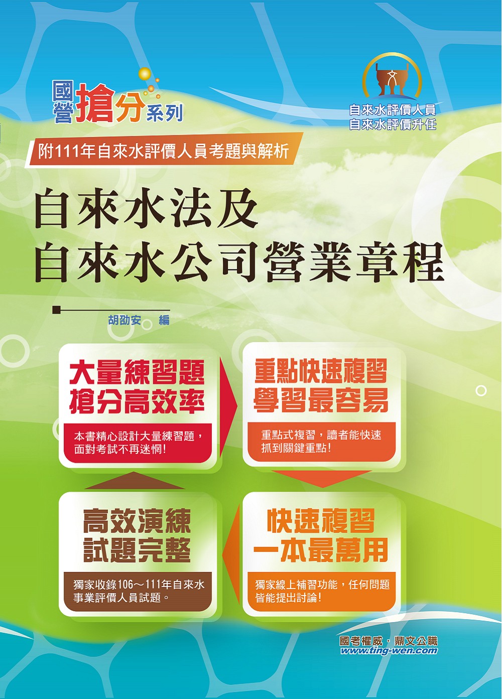 產品目錄 第一部分 內容整理 第一篇 自來水法 Chapter 1 總 則 Chapter 2 自來水事業專營權 Chapter 3 工程及設備 Chapter 4 營 業 Chapter 5 自用自來水設備 Chapter 6 監督與輔導 Chapter 7 節約用水 Chapter 8 罰 則 Chapter 9 附 則 第二篇 台灣自來水公司營業章程 Chapter 1 總 則 Chapter 2 供 水 Chapter 3 申請及異動 Chapter 4 用水設備 Chapter 5 量水器 Chapter 6 抄表收費 Chapter 7 違章取締 Chapter 8 附 則第二部分 高分題庫精練第三部分 自來水法規彙編 自來水法 自來水法施行細則 台灣自來水公司營業章程第四部分 最新試題與解析 106 年台灣自來水公司評價職位人員甄試「自來水法及台灣自來水公司營業章程」試題 107 年台灣自來水公司評價職位人員甄試「自來水法及台灣自來水公司營業章程」試題 108 年台灣自來水公司評價職位人員甄試「自來水法及台灣自來水公司營業章程」試題 110 年台灣自來水公司評價職位人員甄試「自來水法及台灣自來水公司營業章程」試題 111 年台灣自來水公司評價職位人員甄試「自來水法及台灣自來水公司營業章程」試題 最新年度自來水公司評價人員(單複選混合題型)模考試題演練