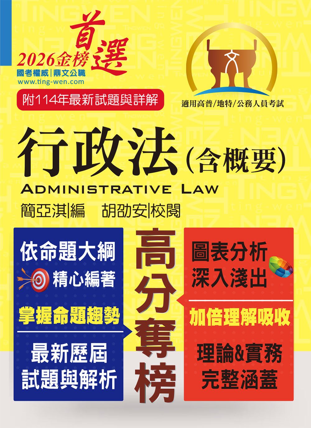 產品目錄 PART 1 重點整理 導 讀 第 1 章 行政與行政法 第 2 章 行政法規之效力 ── 論法規之施行與廢止 第 3 章 行政法之法源 第 4 章 行政法之原則 第 5 章 行政法之適用問題 第 6 章 行政組織之概念 第 7 章 公務員法 (兼論特別權力關係) 第 8 章 行政命令 第 9 章 行政處分 第10 章 行政契約 第11 章 行政事實行為 第12 章 行政罰 第13 章 行政執行 第14 章 行政程序 第15 章 行政救濟 第16 章 訴 願 第17 章 行政訴訟 第18 章 國家責任PART 2 申論題暨測驗題題庫 第 1 回 模擬試題 第 2 回 模擬試題 第 3 回 模擬試題 第 4 回 模擬試題 第 5 回 模擬試題 第 6 回 模擬試題 第 7 回 模擬試題 第 8 回 模擬試題 第 9 回 模擬試題 第10 回 模擬試題PART 3 相關歷屆試題與解析 113 年公務人員高等考試三級考試「行政法」試題 113 年公務人員普通考試「行政法概要」試題 113 年特種考試地方政府公務人員(三等)考試「行政法」試題 113 年特種考試地方政府公務人員(四等)考試「行政法概要」試題 114 年公務人員高等考試三級考試「行政法」試題 114 年公務人員普通考試「行政法概要」試題