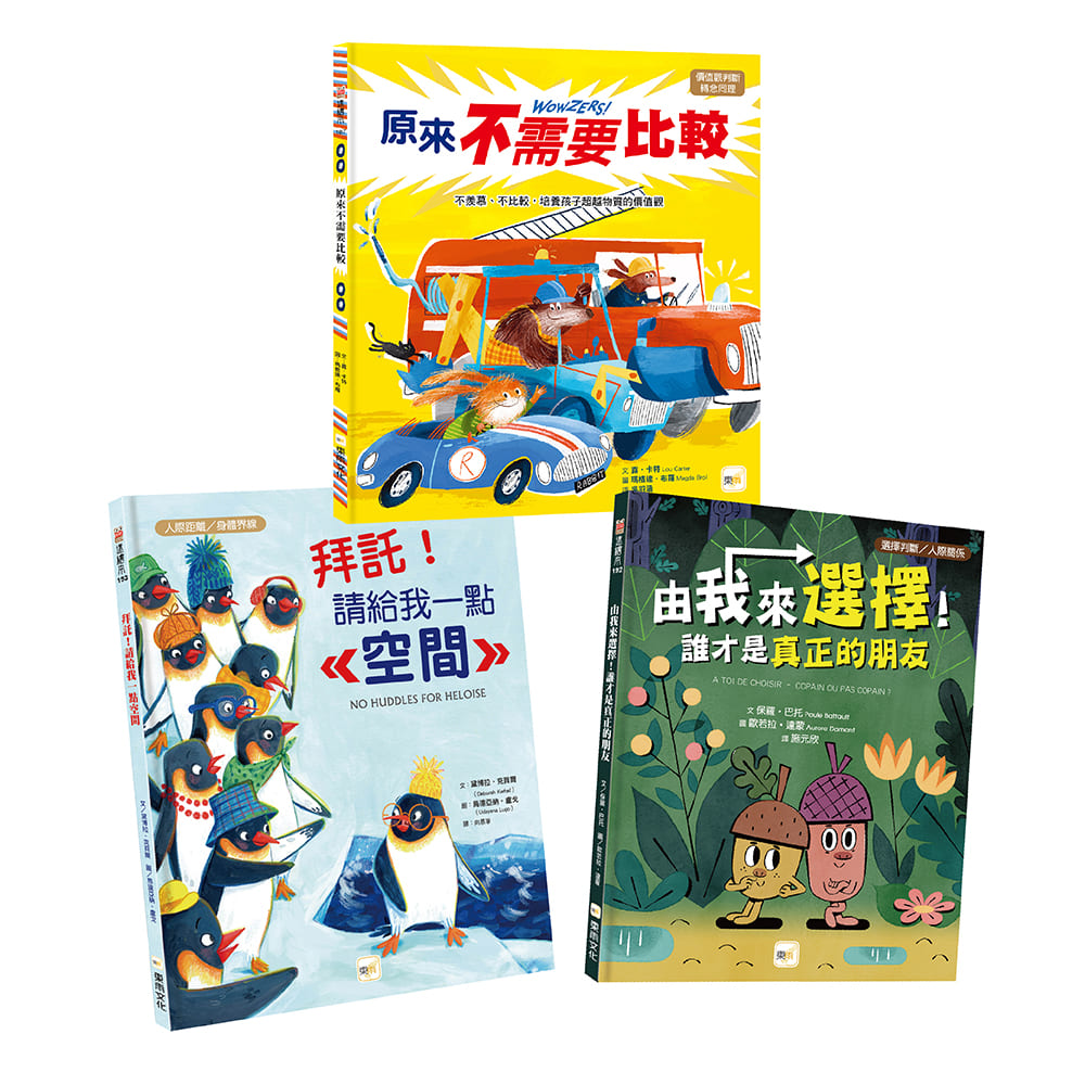 內容簡介 ◆人際關係&性平教育繪本 之一《拜託!請給我一點空間》‧告訴孩子【人際距離】和【身體界線】的重要。‧學習顧慮他人感受,了解每個人都需要【個人空間】。【人際距離/身體界線】企鵝很喜歡貼貼,因為貼貼可以保持溫暖,也能保護大家避免被豹斑海豹攻擊。但企鵝荷露伊不喜歡。跟別人觸碰,只會讓她感到緊張心慌、不舒服……◆人際關係&性平教育繪本 之二《由我來選擇!誰才是真正的朋友》‧透過書中的互動問答題,讓孩子藉由選擇的方式思考。‧學習區分「健康的友誼」和「不健康的友誼」。‧幫助孩子與他人建立良好人際關係。【選擇判斷/人際關係】今天對於小橡實保羅來說,是美好的一天,因為他終於掉落到橡樹下,又能和朋友米歇爾一起玩了。可是,所有的一切都跟他想的不一樣——米歇爾先是不理他,然後又丟他帽子、還嘲笑他,甚至命令他一定要玩騎士遊戲……保羅開始懷疑,米歇爾到底是不是他真正的朋友?◆人際關係&性平教育繪本 之三《原來不需要比較》‧引導孩子學習關懷他人‧培養超越物質的價值觀【價值觀判斷/轉念同理】兔子很喜歡他的新車,他迫不及待地開車上街,要向朋友們炫耀。但,當他看見朋友們的酷炫挖土機、多功能消防車,和不可思議的帆船後,為了超越他們,他便開始一次又一次的新車大改造,希望自己的新車,是街上最受注目的焦點……*學習領域:語文、社會、綜合活動 (人際關係與團隊合作/人際關係與溝通活動、危機辨識與處理/解決問題)、生活課程(身心素質與自我精進/擁有合宜的人性觀與自我觀)、健康與體育(情緒的健康 適當表達自己的情緒) *議題:SDG3「良好健康和福祉」/性別平等教育(身體自主權的尊重與維護)、社交情緒學習、心理健康、情緒教育、品德教育、人際互動