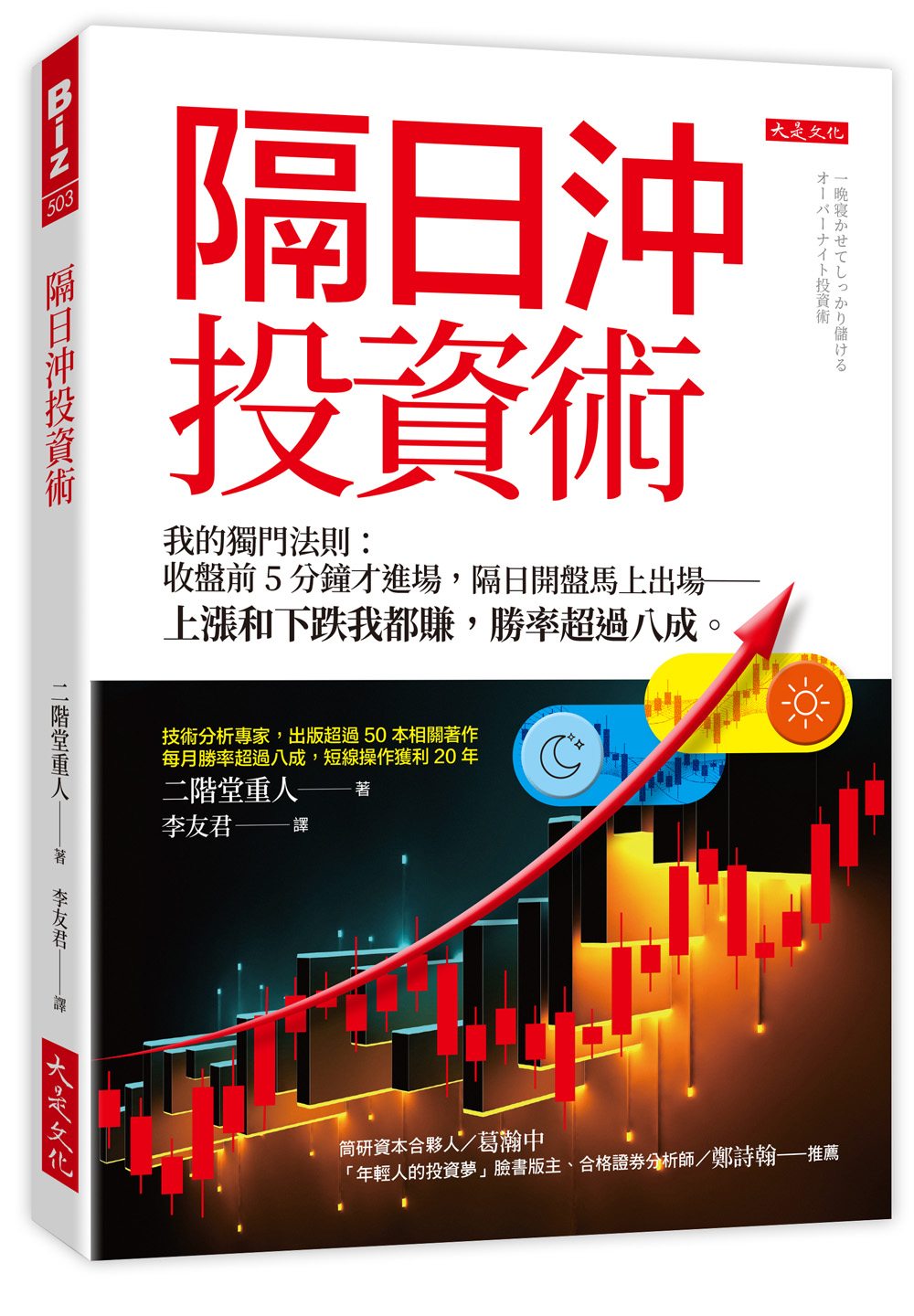 產品目錄 推薦序一 市場難測,隔日沖結合多空應對策略/葛瀚中推薦序二 短線不靠運氣,祕訣在隔日沖的三步驟紀律/鄭詩翰前言 當沖錯過的,隔天賺回來開始前,先搞懂這些投資用語第一章 隔日沖:持倉「兩天一夜」的短線戰術1. 我的獨門技巧:收盤前進場、隔日開盤出場2. 時間這麼短,真能賺到錢?3. 選擇手續費較低的券商4. 即使股價下跌,仍獲利5. 選股關鍵:股價是否跳空6. 盤整,做多做空都能賺7. 萬一暴跌,可避免嚴重虧損8. 鎖定小獲利,偶爾賺到大報酬9. 我該準備多少本金?第二章 隔日沖的獲利基本功1. 我的操作三步驟2. 找出跟前一天相比急漲或急跌的股票3. 收盤前一刻才出手4. 隔天開盤就出場5. 縱使出現帳面損失,也要在開盤時停損6. 要是出現帳面收益,也可部分持有7. 透過信用交易做空8. 並非所有標的都能融資融券9. 觀察5日均線和25日均線10. 布林通道:掌握股價動向11. 做多與做空的持倉範例第三章 何時出手?抓住買進的訊號1. 投資人和交易員都會盯著急漲的股票2. 回檔後的急速反彈,以大陽線作為進場指標3. 藉由布林通道看出上漲趨勢4. 總結:回檔後急速反彈的三大條件5. 實例:組合化學工業6. 實例:關門海7. 練習:健諾迪斯8. 另一種買進型態:收盤價往上突破較長的上影線9. 總結:突破長上影線高點的三大條件10. 實例:賚卡睦11. 實例:Fund Creation Group12. 實例:Visionary Holdings13. 練習:Verite第四章 下跌也獲利的做空策略1. 看準上漲後的下跌2. 跌破5日均線,推測上漲動能已消失3. 總結:上漲後下跌的三大條件4. 實例:日本水產5. 實例:住友電木6. 練習:荏原食品工業第五章 從漲停板挑選標的1. 什麼是漲停板?2. 確認漲幅排行榜3. 漲停板股票要在什麼時機買進?4. 大幅下跌時要停損5. 實例:地域新聞社6. 實例:UMN Pharma7. 實例:ALBERT8. 實例:岡藤控股9. 連續漲停的股票10. 股價漲得越高,風險也就越大11. 反覆下跌好幾次,不要買12. 練習:大村紙業13. 只在上升行情時進場14. 過度篩選,反而減少交易機會第六章 這樣調整持股,做多做空都賺1. 配置關鍵,不在檔數在金額2. 整個市場是上升還是下跌?3. 別只看手中持股,要看大盤4. 看出短期趨勢:日K線搭配5日均線5. 進一步提升判斷精準度6. 走勢平緩時,持股要均衡7. 當下市場氣氛也很重要8. 初學者趁上漲局勢買進9. 指數不漲不跌,依舊創造報酬第七章 我這樣做風險管理1. 持有用來避險的部位2. 股票以外的金融商品:期貨3. 設想指數下跌200點的情況4. 藉由ETF避險,選擇成交量高的標的5. 期貨和ETF哪個好?結語
