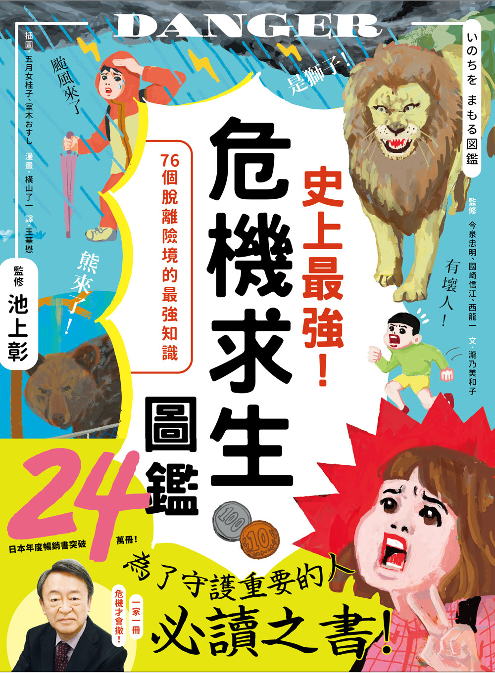 作者介紹 【監修簡介】池上彰 Akira Ikegami1950年出生於長野縣。1973年以記者身分進入NHK(日本放送協會)。經歷島根縣、廣島縣的職涯後,調至東京報導局社會部,負責採訪犯罪、事故、災害、教育問題等。1994年至2005年,在NHK節目「週刊兒童新聞」中扮演「爸爸」角色。2005年獨立,以自由記者身分前往世界各地,同時在名城大學、愛知學院大學、東京工業大學、立教大學等多所大學擔任教職。今泉忠明 Tadaaki Imaizumi畢業於東京水產大學(現・東京海洋大學)。曾在國立科學博物館學習哺乳類的分類學與生態學。參與過文部省(現・文部科學省)的國際生物學事業計畫(IBP)調查、環境廳(現・環境省)的西表山貓生態調查等。曾擔任上野動物園的動物解說員,現為東京動物園協會評議員。同時也擔任「殘念生物圖鑑」(ざんねんないきもの事典)系列(高橋書店)和「事出有因滅絕生物」(わけあって絶滅しました。)系列(鑽石社)的監修。國崎信江 Nobue Kunizaki危機管理顧問、危機管理教育研究所代表。身為女性,從日常生活的觀點倡導天災、犯罪及意外事故的防範對策。曾擔任國家和地方政府多個防災相關委員會的委員,並擔任《10歲就懂的防範犯罪和天罪》(10才からの防犯・防災/永岡書店)和《護身繪本》(おまもりえほん/日本圖書中心)等書籍的監修。西龍一 Ryuichi Nishi醫師、公共衛生學碩士、急診專科醫師。現任職於南町田醫院急診科,並擔任帝京大學醫學部急診醫學講座兼任講師。畢業於帝京大學醫學部。作為急診醫師,每天診療各種疾病和外傷,發生天災時則前往災區進行醫療活動。同時也致力於簡明地向市民傳達急救和災害醫療的知識。【撰文簡介】瀧乃美和子Miwako Takino著作有「爆笑世界史(やばい日本史)」系列(鑽石社)、「少女的日本史(乙女の日本史)系列(KADOKAWA)、「白熊兄弟(しろくまきょうだい)」系列(白泉社)、「小貓親親(こねこのすりすり)」(PIE International)等。【插畫簡介】五月女桂子 Keiko Sootome插畫家、散文家、漫畫家。大學畢業後,依靠自學成為插畫家。著有《少女的生存手冊》(乙女のサバイバル手帖/平凡社)、《一起讀古事記!!》(レッツ!!古事記/POPLAR社)、《寵孩的爸媽》(親バカ本/合著,Magazine House)等作品。室木おすし Osushi Muroki插畫家、漫畫家、三寶爸。著作有《偶爾拿得出來的稱讚》(たまに取り出せる褒め)、《拿著貴重棒子的貓》(貴重な棒を持つネコ)(皆KADOKAWA)、《你們就跟孩子一樣》(君たちが子供であるのと同じく/双葉社)、《悲傷大猩猩川柳》(朝日新聞出版)。橫山了一 Ryoichi Yokoyama漫畫家。出生於北海道釧路市。著有《戰國同人誌即售會》(戦国コミケ)、《一邊的家庭崩壞的漫畫》(どちらかの家庭が崩壊する漫画)(皆KADOKAWA)、《兒子對我態度很差,所以畫成漫畫》(息子の俺への態度が基本的にヒドイので漫画にしてみました。/LEED社)、《北邊的老公,西邊的老婆》(飛鳥新社)等。妻子是漫畫家加藤真弓(加藤マユミ)。【譯者簡介】王華懋譯作遍及推理、文學及實用等各種類型。包括:《便利店人間》、《孿生子》、《流浪的月》、《不被愛也沒關係》、《遙遠的布萊梅》、《史賓諾莎診療室》(以上為悅知文化出版);《滅絕之園》、《通往謀殺與愉悅之路》、《如幽女怨懟之物》、《被殺了三次的女孩》、《dele刪除》系列、《百鬼夜行》系列等。