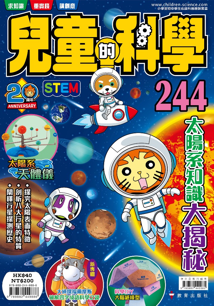 內容簡介 今期主題:太陽系知識大揭秘.科學實踐專輯:競選!太陽系「星球之最」!愛因獅子、萊萊鳥、倫倫體驗一個有關太陽系星體選舉的VR遊戲。當中各個星球全力拉票,到底誰是冠軍?過程中將會探究八大行星的特質、太陽表面的特徵,還會闡釋過往一些行星探測的資料。.新專欄:大偵探福爾摩斯的古生物童話世界。福爾摩斯與一眾角色在各個童話故事粉墨登場,並從中介紹多種在遠古生活的動植物。今期小兔子深入海中,見識史前巨型海龜——古巨龜的生態習性以及其生活海域的環境特徵。.新專欄:大偵探福爾摩斯破解四字成語科學之謎。大偵探透過各個四字成語,去探究箇中科學原理。今期李大猩和狐格森又為案件向福爾摩斯求救,而難題竟是要如何種花?當中解說「曇花一現」及「鐵樹開花」兩個成語,原來現代曇花與成語中的曇花並不相同?鐵樹根本開不了花?今期將為大家一一講解!.科學新領域。每期由不同專家去論述各種科學知識。今期「海洋公園大搜查」由海洋公園教育部講解保育員如何照料大熊貓的飲食,還有熊貓餐單大公開!.數學偵緝室:猩級導航。福爾摩斯與李大猩和狐格森乘船橫渡英倫海峽時發生沉船意外,打算划救生艇回英國。只是大海茫茫,究竟該划向哪方?最終他們能否順利回到英國?故事以漫畫與專欄結合方式,解說方向與方位角的知識。讀者閱讀時還可嘗試解開當中的數學謎題,訓練計算能力!.漫畫 科學Q&A:遙遠的行星。小松等人與小Q觀星時,突然收到宇宙巡邏隊的緊急通知,表示小T在巡航時失去聯絡。為了找回小T,他們立即前往天王星,並一直沿線索追蹤,結果竟在古柏帶發現有極不尋常的事情,到底怎麼回事?其間小Q會簡略解說天王星與海王星的特質,並深入探究冥王星、古柏帶等外太陽系的結構與環境。.科學DIY:方塊大腦模型。為了知道聰明人的腦袋有甚麼特徵,頓牛從愛迪蛙那裏找來各種奇特的腦袋,當中還用紙做出一個有趣的大腦模型。當中將會解說大腦的基本結構,以及各部位的功用。