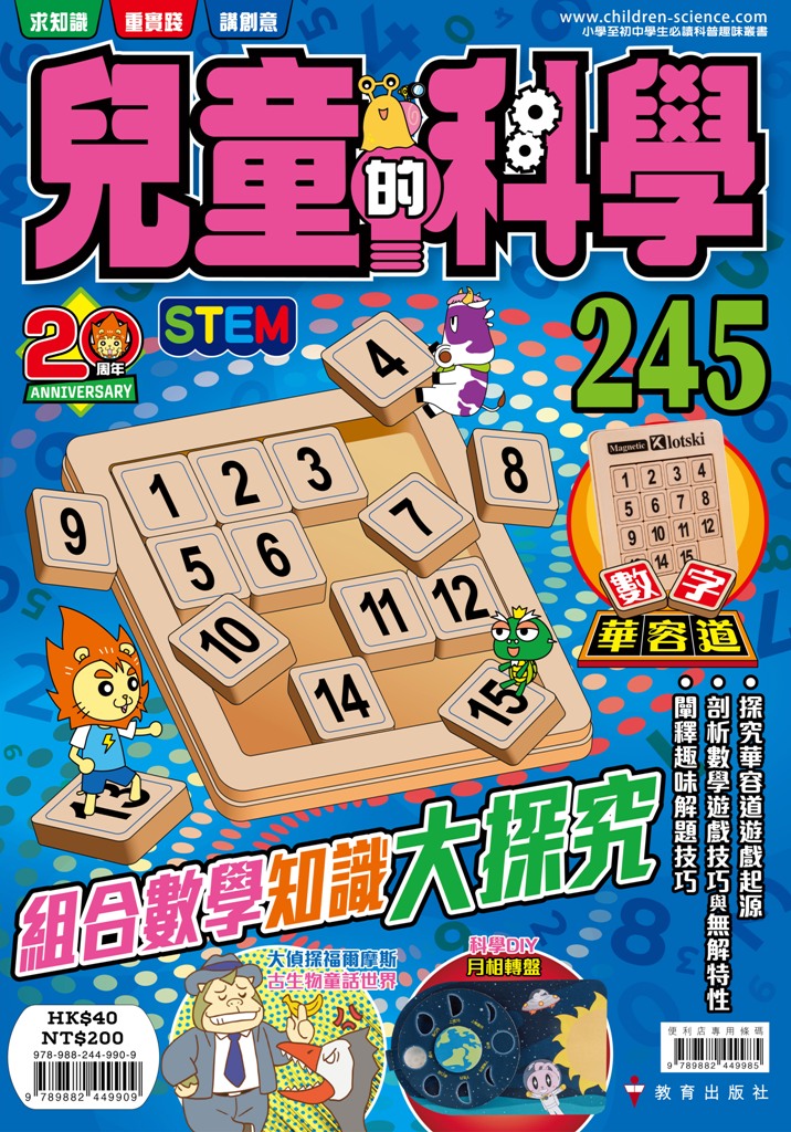 內容簡介 今期主題:組合數學知識大探究.科學實踐專輯:頓牛智破難題大懸賞!遊戲商人愛迪蛙舉辦數字拼圖公開賽,參加者只要能解開他提出的6個難題,就能獲得豐厚的獎金。頓牛、愛因獅子等人挑戰難題,卻發現拼圖中有些古怪的地方。究竟誰能勝出比賽?過程中他們將會講解「華容道」遊戲的起源、一些數學遊戲解題技巧,還有數學上的無解特性。.新專欄:大偵探福爾摩斯的古生物童話世界。福爾摩斯與一眾角色在各個童話故事粉墨登場,並從中介紹多種在遠古生活的動植物。今期李大猩查案時竟遇上一種既像鳥又似恐龍的生物——始祖鳥,到底牠有甚麼特別之處呢?.新專欄:大偵探福爾摩斯破解四字成語科學之謎。大偵探透過各個四字成語,去探究箇中科學原理。今期福爾摩斯與李大猩帶同小兔子到牧場騎馬查案。豈料李大猩竟中途失蹤,只剩下馬兒向二人求救!究竟他身在何方?當中解說「老馬識途」及「白駒過隙」兩個成語,馬是否具備辨認路途的能力?馬力是甚麼東西?今期將為大家一一講解!.科學新領域。每期由不同專家去論述各種科學知識。今期由世界自然基金會香港分會講解香港的生物多樣性。香港雖是彈丸之地,也有不同種類的生物棲息其中呢!.數學偵緝室:停電穿襪時。福爾摩斯與李大猩和狐格森查案期間入住酒店。就在三人準備休息之際,他們收到犯人去向的線報,於是準備出發。這時酒店突然停電,四周變得漆黑一片。雖知情況趕急,李狐二人卻爭辯要怎樣才能穿好一雙款式一樣的襪子出門,大偵探會如何解決這看似無聊的爭執呢?故事以漫畫與專欄結合方式,解說鴿巢原理的知識。讀者閱讀時還可嘗試解開當中的數學謎題,訓練計算能力!.漫畫 科學Q&A:晝夜難眠。小松近來每晚都被爸爸的鼻鼾聲吵到睡不了,以致白天時疲憊不堪。另一方面,小Q與小T收到線報,許多人都出現不同的睡眠障礙,懷疑當中另有內情。其間小Q將解說睡眠窒息症、夢遊、咖啡影響睡眠的原因、床褥構造等知識。.科學DIY:神奇月亮盤。在一次太空任務中,太空人居兔夫人意外得到一塊可改變月亮形狀的「神奇月亮盤」,決定前往太空親眼見證月亮形狀的變化,開始探索月球的奇妙旅程。過程中將會解說月相、潮汐鎖定等知識。