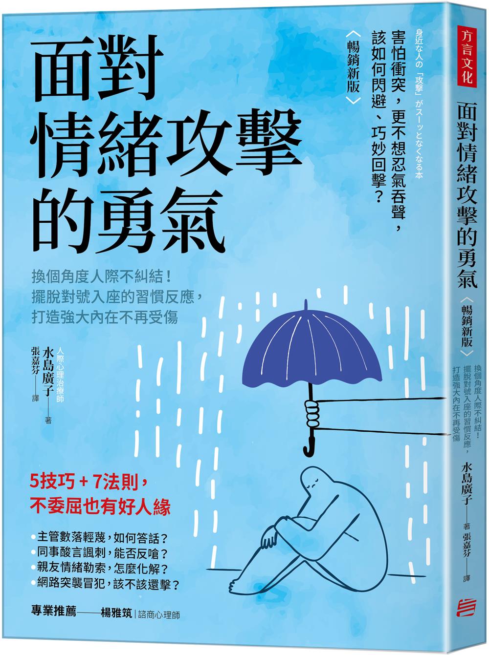 內容簡介 本書簡介別人存心令你難堪,反擊卻怕壞了交情;默默承受有礙健康,不理會只能淪為內傷……日本權威心理師,教你運用「5技巧+7法則」,99%都能解決!學會「處理攻擊」擺脫糾結,不委屈自己也有好人緣!以下狀況,是否曾讓你不知所措?主管數落輕蔑,如何答話?同事酸言諷刺,能否反嗆?親友情緒勒索,怎麼化解?網路突襲冒犯,該不該還擊?★人際間的酸言冷語,讓你疲憊不堪?明明沒錯,卻莫名遭受責罵、冷言冷語、無視......相信有多人會因為不想與人正面衝突,而選擇忍隱忍退讓,最後反而加深內心的挫折感。其實,你不必強迫自己反擊,也能化解這些委屈。人際心理治療師、本書作者水島廣子告訴你──記住一個大原則「會發動攻擊的人,都是有困擾的人」,就再也不用害怕莫須有的攻擊,並且能找到化解之道。比方說,動不動就反應過度的人,往往來自「心靈曾經受創」、「難以適應變化」或「自卑」所致。面對這樣的人,以下幾種狀況特別容易引發他們的攻擊──‧你簡單問好,對方覺得「隱私受到侵犯」;‧你提出疑問,對方覺得「被責罵」;‧你表達看法,對方覺得「自尊受創」;‧你做了對方內心渴望的事,招致忌妒。★學會5技巧,從衝突糾結中脫身,不再受傷! 當你自覺受到傷害的當下,或許會懷疑自己「做錯了什麼」?但與其自責,最重要的就是先接受這是一種「正常反應」,不讓情緒被對方牽著走。接著,利用書中傳授的5技巧轉念,就能把攻擊帶來的挫折感,化為勇敢面對的力量!不僅能保護自己不受傷,更能讓那些傷害「什麼都不是」。例如──【攻擊】資深同事出紕漏,卻指責都是我的錯。【暗藏訊號】問題超過對方的能力範圍,又拉不下臉承認自己無能。【轉念】「這是『求救』訊號,無須感到委屈,態度好一點就幫忙囉!」►►指責是引誘你「對號入座」的陷阱,平靜看待免成受害者。【攻擊】找朋友商量煩惱,對方竟說「你也太軟弱了」。【暗藏訊號】認定別人「軟弱」的人,通常內心都有尚未痊癒的傷口。【轉念】不做任何多餘詮釋,說聲「原來你這麼想」即可。►►不妨評估對朋友的往來「有多少期待」,或找更合適的對象商量。★擁有面對情緒攻擊的勇氣,不委屈也有好人緣沒有人喜歡受到朋友忽略、同事白眼、上司看輕,甚至家人責難。不過,當你因渴求受人「重視、愛護」而採取行動時,可能會因為太過刻意造成反效果,跟著《面對情緒攻擊的勇氣》提供的方法,成一定能為旁人打從心底喜歡、深獲重視的人,例如──►►【法則1】尊重自己的意願:別接下「受害者」的角色。►►【法則2】拋開「施與受」的執念:越不求回報,別人給的越多。►►【法則3】言行一致,容易贏得信任:今天親切有禮,隔天態度冷淡,令人無所適從。本書特色★ 5個轉念技巧,為內心撐起免受攻擊的防護傘;★ 7條處世原則,大膽做自己也隨時受人呵護。