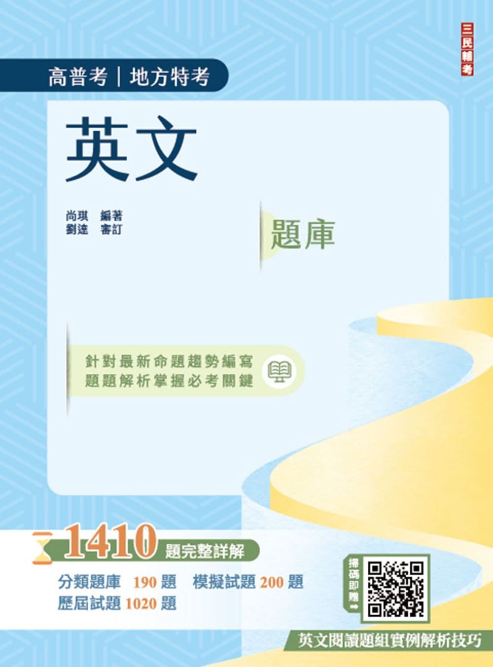 產品目錄 第一部分 主題式分類題庫第一篇 字彙主題一 名詞主題二 動詞主題三 形容詞主題四 副詞實力演練第二篇 文法主題一 動詞時態主題二 動名詞與不定詞主題三 條件句與假設語氣主題四 關係子句主題五 間接問句主題六 分詞構句主題七 被動語態主題八 名詞與代名詞實力演練第三篇 克漏字測驗綜合測驗實力演練第四篇 閱讀測驗主題一 主旨句主題二 閱讀理解主題三 特殊字詞實力演練第二部分 模擬試題第一回第二回第三回第四回第五回第六回第七回第八回第九回第十回第三部分 歷屆試題詳解106年公務人員普通考試試題106年公務人員高考三級考試試題106年鐵路人員特種考試試題(員級)106年司法人員特種考試試題(四等)107年公務人員普通考試試題107年公務人員高考三級考試試題107年鐵路人員特種考試試題(員級)107年司法人員特種考試試題(四等)108年公務人員普通考試試題108年公務人員高考三級考試試題108年鐵路人員特種考試試題(員級)108年司法人員特種考試試題(四等)109年公務人員普通考試試題109年公務人員高考三級考試試題109年鐵路人員特種考試試題(員級)109年司法人員特種考試試題(四等)110年公務人員普通考試試題110年公務人員高考三級考試試題110年鐵路人員特種考試試題(員級)110年司法人員特種考試試題(四等)111年一般警察人員三等考試試題111年一般警察人員四等考試試題111年公務人員高考三級考試試題111年公務人員普通考試試題111年司法人員特種考試試題(三等)111年司法人員特種考試試題(四等)111年特種考試原住民族考試試題(三等)111年特種考試原住民族考試試題(四等)111年特種考試地方政府公務人員考試試題(三等)111年特種考試地方政府公務人員考試試題(四等)112年一般警察人員三等考試試題112年一般警察人員四等考試試題112年公務人員高考三級考試試題112年公務人員普通考試試題112年司法人員特種考試試題(三等)112年司法人員特種考試試題(四等)112年特種考試原住民族考試試題(三等)112年特種考試原住民族考試試題(四等)112年特種考試地方政府公務人員考試試題(三等)112年特種考試地方政府公務人員考試試題(四等)113年一般警察人員三等考試試題113年一般警察人員四等考試試題113年公務人員高考三級考試試題113年公務人員普通考試試題113年司法人員特種考試試題(三等)113年司法人員特種考試試題(四等)