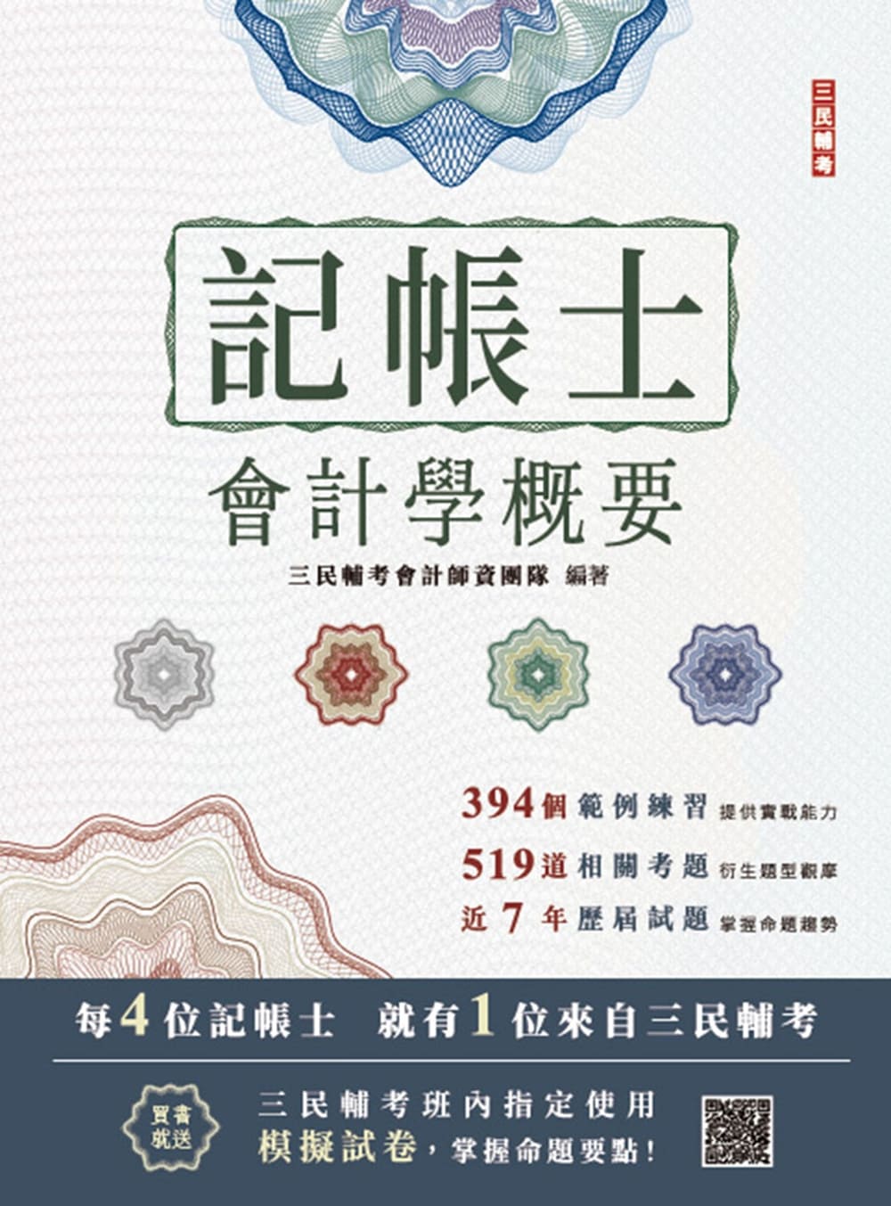 內容簡介 市面上會計學何其多,您為什麼要選擇三民輔考出版的呢? 第一、 本書導入三民輔考團隊完整會計師資,從企劃、撰寫、解題,均由資深名師協同編輯分工合作,集所有專業於大成,絕非其他出版社一人著作可相較比擬。 第二、 採納上榜生建議,年年改版,內容去蕪存菁,抓緊命題趨勢,編撰的內容,都是最常考的重點,精讀或考前衝刺都適用! 第三、 一本抵多本,本書不僅收錄記帳士的例題,尚含括會計師、銀行招考、公職特考……等會計學試題,若您是企圖心十足,想做遍各類題目的考生,這本絕對物超所值! 市場見證,上榜生口碑相傳! 本書自2013年出版以來即成為三民補習班記帳士面授與函授專班上課用輔助教材並對外銷售,年年改版,累積銷售量已朝向30,000冊邁進,可以說每3位記帳士考生中就有1位選購本書,持續獲得考生的青睞已逾10年,想考記帳士的您還在猶豫要不要加入購物車結帳嗎?小心晚了搶不到唷! 記帳士考試採及格制,只要平均60分即可考取,無須與其他考生競爭錄取名額。112年度有500多位考生考取記帳士證照,錄取率約12%,相較於其他國家考試,是及格率與投資報酬率較高的選擇! 記帳士出路範圍廣,囊括了會計及稅務,可獨立開設或加入大型記帳士事務所,論件計酬、待遇佳,也能轉往其他會計金融業,或財稅相關國家考試,不必擔心未來職涯發展遇上瓶頸。 本書四大亮點: ★394個範例練習,提升實戰能力。 ★519道相關考題,衍生題型觀摩。 ★近7年歷屆試題收錄,掌握命題趨勢。 ★隨書附贈記帳士模擬試卷,厚植應考實力! 【本書適用】 這本《會計學概要》(書號:9786267579718)適用於專技普考:記帳士考試。 【本書特色】 》依據IFRS及EAS編修,切合命題大綱 本書係根據專門職業及技術人員普通考試記帳士考試命題大綱公告之會計學命題範圍,以及國際財務報導準則、企業會計準則相關規範編寫而成,12大章節囊括常考重點主題,包含調整、錯誤更正、財務報表、收入認列準則、銀行往來調節表、應收款項、存貨、營業用資產、金融資產、負債、公司會計、現金流量表、財務報表分析等。另外亦包括近年出題率呈現上升趨勢的內容,如:投資性不動產、生物性資產、應付公司債攤銷及提前贖回、可轉換公司債、製造業會計等,皆由編著團隊彙整收錄書中。 》重點速記,實戰模擬試題驗收學習成效, 書中的核心概念和詞句以「粗體」醒目突出標示,以幫助讀者更快地理解和記憶重點內容,從而節省準備考試的時間。而除了在重要內容環節附有與主題相應之300多道「範例練習」,各章最後亦附有400多道「相關考題」,除收錄記帳士考題外,亦搜羅如高普考、國營、或銀行等與內容相關之試題,讓讀者準備記帳士考試之餘,也可以參考其他考試單位的出題趨勢,用最省力的方式,獲得最大效益。 》歷屆試題加持,考試趨勢全掌握 本書收錄近7年記帳士考試歷屆試題,且題題詳解,讓考生鑑往知來,了解考情趨勢及出題脈絡,高效率厚植應考實力。 》贈品 記帳士考試模擬試卷 隨書附贈「記帳士考試模擬試卷」,幫助考生在最後階段全面強化應戰實力,多年來累積口碑,千名上榜生一致推薦。試卷只送不賣,詳情請掃書封QRcode! 【命題趨勢分析】 ◎依近年歷屆試題來看命題方向,題目較常出現之主題為調整、錯誤更正、財務報表、收入認列準則、銀行往來調節表、應收款項、存貨、營業用資產、金融資產、負債、公司會計、現金流量表、財務報表分析等,另外,投資性不動產、生物性資產、應付公司債攤銷及提前贖回、可轉換公司債亦逐年加重比例,而製造業會計比起往年,出題率有上升趨勢。 ◎歷年來命題委員往往會將IFRS的公報列入考試題目中,須加強注意新公報之規範。 ◎中級會計占比雖不高,但近年記帳士考試的內容難度有逐漸升高趨勢。 ◎除了具備初會的基本概念外,更需加強試題分析、申論、時事等綜合靈活運用能力。