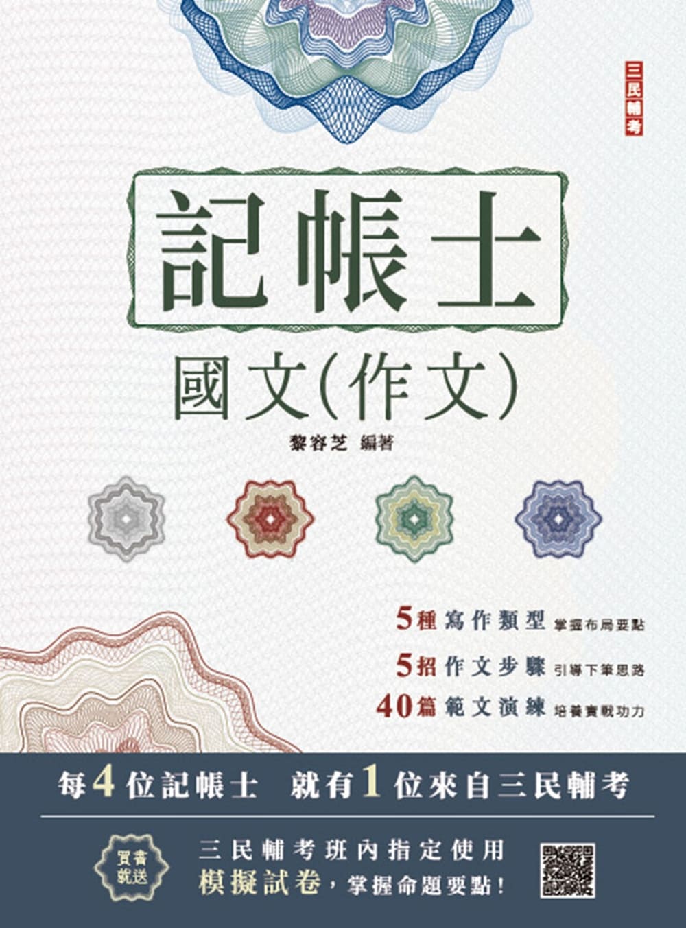 產品目錄 PART 1 引導式作文–寫作教學題型解析作文的基本步驟審題構思布局修辭檢查PART 2 引導式作文–精選範文人生哲理類理想立志類社會議論類古典名句類PART 3 多元型式作文–寫作教學題型解析接續引文寫作關鍵字寫作新聞稿寫作政策說帖寫作公開信寫作PART 4 多元型式作文–模擬實戰試題一、靈感抒發試題二、人文評論試題三、仿效譬喻試題四、歸納分析試題五、情境感受試題六、演繹推論試題七、文意解讀試題八、圖表判讀試題九、新聞稿寫作試題十、政策說帖寫作試題十一、公開信寫作試題十二、關鍵字寫作附錄實用成語篇名言佳句篇作文的標準格式PART 5 最新試題112年不動產經紀人、記帳士考試試題112年地政士考試試題112年第一次社會工作師考試試題112年第二次社會工作師考試試題113年不動產經紀人、記帳士考試試題113年地政士考試試題113年第一次社會工作師考試試題113年第二次社會工作師考試試題