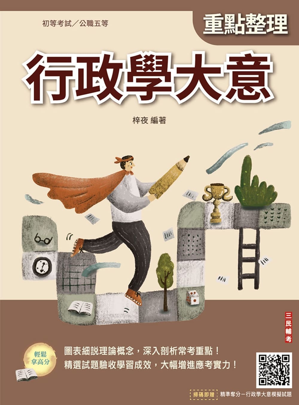 內容簡介 擁有40餘年補教經驗,三民輔考專業師資不藏私傳授!就算是初等考只考單選題,您也得有一本面面俱到,能扎實貼合命題脈絡的好書,才能保證絕不失分,看到題目,就直覺聯想到答案。 行政學本身是一門範圍廣泛的科目,凡涉及公共利益的內涵皆與本學科有關聯,包含探討組織靜態面與動態面,以及組織與外部環境互動的相關議題,如:危機管理、政府行銷與公眾關係以及行政革新等內容。 本書主打0基礎,國考小白也能懂! 作者將行政學大意化繁為簡以系統化方式呈現,七大章節主題分門別類,幫助考生清楚建立理論脈絡與整體架構,逐步累積行政學的認知,再搭配考古題的練習,掌握命題趨勢,在短期內迅速提升戰力值,讓您一次就考上,順利擠進公務員窄門! 本書三大特色無人能及: ★自學速成!七大重點章節,精準聚焦命題方向 ★題題詳解!收錄最新歷屆試題,老師解析神助攻 ★獨家贈品!買書即送「精準奪分-初五等行政學大意模擬試題」 【適用對象】 這本《行政學大意》(書號:9786267679432)適用於報考「初等考試」、「身心障礙人員五等考試」、「原住民族五等考試」一般行政類科的考生。 【本書特色】 .坊間行政學書籍又重又厚,考前真的看得完? .學說理論龐雜無比,怎麼準備最有效率? .選擇題要怎麼判斷才會快又準? 》繁雜學說內容深入淺出 本書根據初五等行政學大意考科的命題方向為考生整理了七大主題,包括:行政學基本概論、組織理論、人事與財務、公共政策與決策理論、行政環境、行政運作與管理技術、行政倫理,且由於行政學相關學說較為繁雜,本書為提高考生準備效率,重點整理部份透過條列及圖表的統整,以深入淺出的方式幫助考生輕鬆吸收! 》老師補充說明重要觀念 本書在重點整理部份精心設計了「老師補充」這個小單元,目的在於補充說明行政學各家學說當中經常被提及的重要概念,藉由此一小工具,讓讀者在研讀時不再知其然而不知其所以然! 》精選試題驗收學習成果 本書各章後皆附「精選試題」,收錄大量和該章內容相關的試題,讓考生每研讀完一章,便可立即進行實戰演練,以最有效率的方式驗收每個章節的學習成果! 》歷屆試題掌握命題重點 本書收錄112~114年行政學大意歷屆試題共8份,合計400題考古題,所有題目皆由三民輔考名師提供詳盡解析,免除還要去找解析訊息的麻煩,將寶貴時間留下來厚植自己的應考實力,金榜題名非你莫屬! 》贈品 精準奪分-初五等行政學大意模擬試題 買書就送「精準奪分-初五等行政學大意模擬試題」,由三民輔考名師精選試題,幫助考生在最後衝刺階段檢驗自我,實力再升級,歷屆上榜生一致推薦,試題只送不賣,詳情請掃書封QRcode!