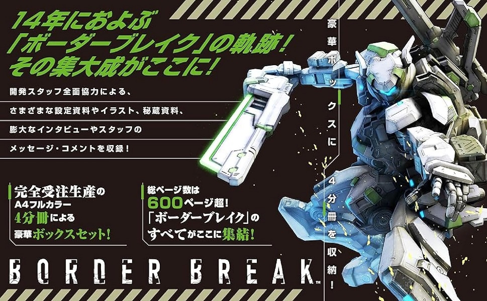 內容簡介 開発スタッフ全面協力による、さまざまな設定資料やイラスト、秘蔵資料、膨大なインタビューやスタッフのメッセージ・コメントを収録!完全受注生産のA4フルカラー4分冊による豪華ボックスセット!総ページ数は600ページ超!「ボーダーブレイク」のすべてがここに集結!■収録内容 その1&2膨大なブラスト・ランナーや武器、メカニックの設定資料集アーケード版およびPS4™版で登場したブラスト・ランナーはもちろん、多岐にわたる武器と登場メカニックの設定資料を数百ページ数にわたって収録。プレイヤーたちが激闘の果てに思いを刻み込んだステージマップも掲載。中には公開期間の短かったレアステージも!?■収録内容 その3イベント登場キャラを含むキャラクターイラストを大量収録アーケード時代のイラストから、PS4™版でのイベント関連のイラストなども最大限収録!キャラクターデザイナー上岡大介氏らによる描き下ろしピンナップも!■収録内容 その4激闘の14年を振り返る!膨大なスタッフインタビューや各種読み物を収録開発スタッフのインタビューをはじめ、多彩なスタッフや関係者へのインタビューを敢行! スタッフコーナーではメッセージを多数収録! 総勢20名以上!全国のプレイヤーによるプレイデータをもとに数字から検証する「ボーダーブレイク」のあの日あの時など、思い出の数々を可能な限り振り返る!※各収録内容は変更になる場合があります。