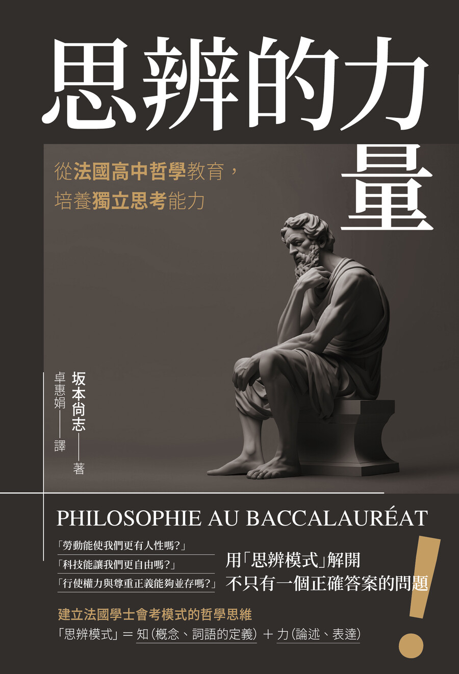 內容簡介 ~哲學,是為了讓你學會對「理所當然」產生質疑~從法國高中生的學士會考,理解「思考」與「表達」的真正方法!【本書特色】◎從法國學士會考的哲學試題切入,完整剖析試題下的整體「思辨模式」。◎解構「思辨模式」的要素,並帶領大家實際練習如何運用「思辨模式」處理問題。◎跨領域思考訓練書,適合學生、已經出社會的各行各業人士閱讀。「勞動能使我們更有人性嗎?」「科技能讓我們更自由嗎?」「行使權力與尊重正義能夠並存嗎?」這些既宏大又尖銳的問題,其實是法國高中生的學士會考哲學試題,學生們必須在4小時內,完成一篇相當於小論文、具有邏輯的文章。他們是如何做到的?這麼做的目的又是什麼?難道法國熱衷於培養出卓越的哲學家嗎?◤在法國,哲學不只是菁英的學問、選修的課程, 而是每個公民都必須學會的思考訓練。 ◢本書不談論深奧的哲學理論,也並非艱澀難懂的哲學史導讀,旨在帶領讀者一窺法國高中教育最核心的價值──作為「公民教育」基石的哲學思辨模式。透過實際的考題解析與結構性思辨訓練,作者揭示法國學生如何在「1年內」習得一套人人都能掌握的【思辨模式】:從定義問題、拆解概念、收集論據到撰寫具說服力的文章,層層堆疊出具邏輯與深度的論述能力;透過這樣的訓練,培養出能清楚思考、理性對話、條理表達的能力。在「什麼是對的」無法簡單回答的時代,從新聞閱讀到政策思辨、從職場對話到社群發言,都能清楚表達立場、尊重不同觀點、共同尋找合理答案,正是身為公民的我們該具備的基本素養。翻開《思辨的力量》,從一套法國的哲學課開始,重新學習如何思考世界!