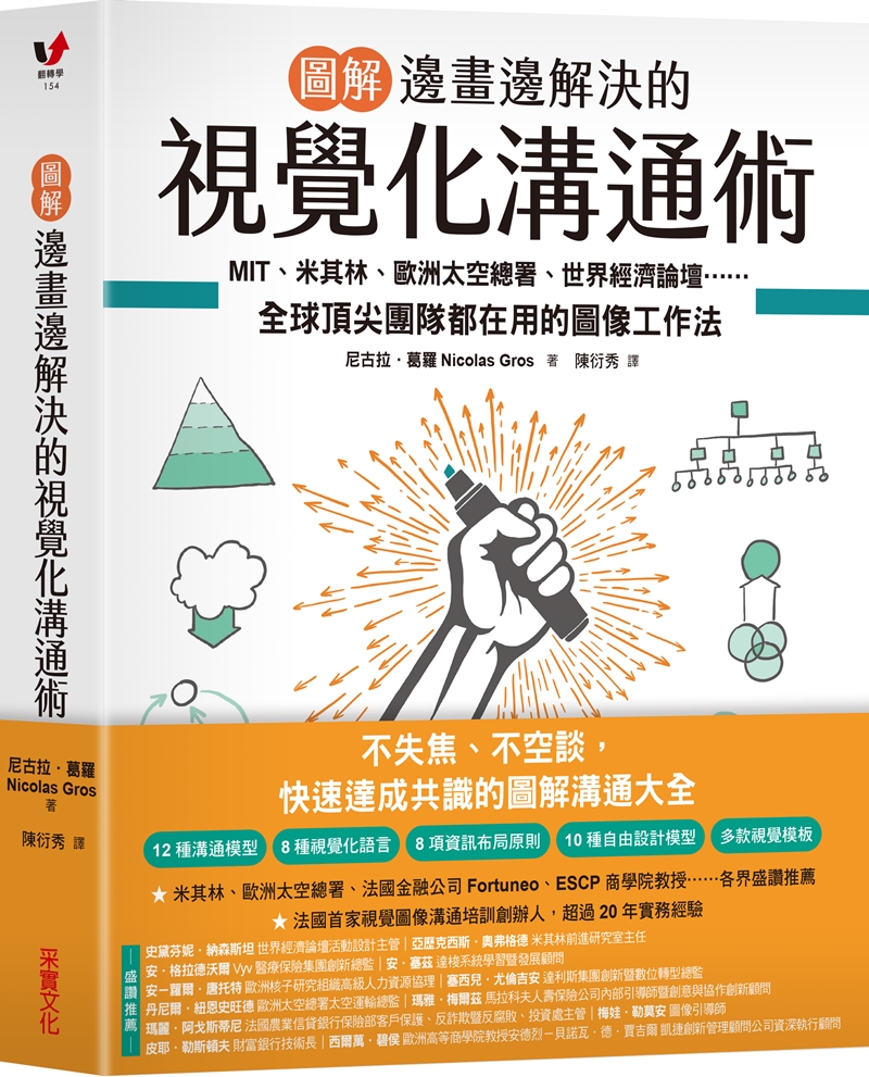 內容簡介 \國際機構指定培訓教材/ 米其林、歐洲太空總署、世界經濟論壇⋯⋯ 在資訊爆炸、溝通低效的時代, 一張圖,勝過千萬語, 但多數人想做到,卻不容易。 其實,視覺化就像學語言, 只要掌握基礎的「圖像詞彙和文法」, 就算資訊、思緒再亂、再複雜, 也能讓開會更聚焦、企劃更清晰、溝通更高效! ★Airbus、MIT、法國國防部、世界經濟論壇……都在用的視覺化溝通大全 ★米其林、歐洲太空總署、法國金融公司Fortuneo、ESCP商學院教授……各界盛讚推薦 ★法國首家視覺圖像溝通培訓創辦人,超過20年實務經驗 ★4步驟視覺模型 × 12款視覺模型 × 8種視覺化語言 × 8項資訊布局原則 ►在資訊爆炸的時代,用圖像一眼看清全貌 會議討論、專案協作、策略規劃…… 資訊越來越多,時間卻越來越少。 學會圖像化,你就能輕鬆做到—— .在一張圖中呈現所有關鍵資訊 .幫助團隊迅速理解全貌,讓組員充分發揮 .縮短溝通時間,讓會議效率大幅提升 法國首家視覺圖像溝通培訓課程創辦人尼古拉.葛羅, 多年協助米其林、歐洲太空總署、世界經濟論壇等國際機構, 以圖像引導方法化解跨部門、跨文化的溝通僵局, 讓不同專業背景的團隊快速找到共識、推動決策, 是歐洲視覺化溝通領域的權威專家。 ►不需要會畫畫,只要掌握視覺化語言就能上手 許多人聽到「圖解」就退避三舍,擔心自己畫不好、畫不快。 其實,圖像化的重點不是畫得漂亮,而是讓資訊清楚、結構化、容易理解。 書中整理出8種視覺化語言,包含: .線條與框架:區隔層次、凸顯重點 .箭頭:標示因果與關聯,清楚顯示流程 .人物與圖示:呈現角色、職責與互動情境 .顏色與空間:引導視覺焦點、提升辨識度 掌握這些基本詞彙與簡單視覺文法, 人人都能成為圖像表達高手。 ►適用各種情境:會議、簡報、筆記…… 無論是會議討論、簡報提案、專案規劃、創意思考⋯⋯ 圖像思考都能幫你快速整合與表達資訊—— .4步驟視覺模型:讓長篇內容轉換成圖像,一目了然 .同步繪圖技巧:邊聽邊畫,捕捉討論重點 .8項資訊布局原則:協助設計大型會議圖像 .12款高效會議視覺模型 本書完整收錄視覺化溝通的核心技巧與大量實戰範例, 帶你從零開始掌握圖像詞彙、視覺模型與資訊布局原則, 不只釐清問題、抓住重點,更能提升會議、企劃、溝通的效率, 是你在職場上不可或缺的視覺化溝通大全!