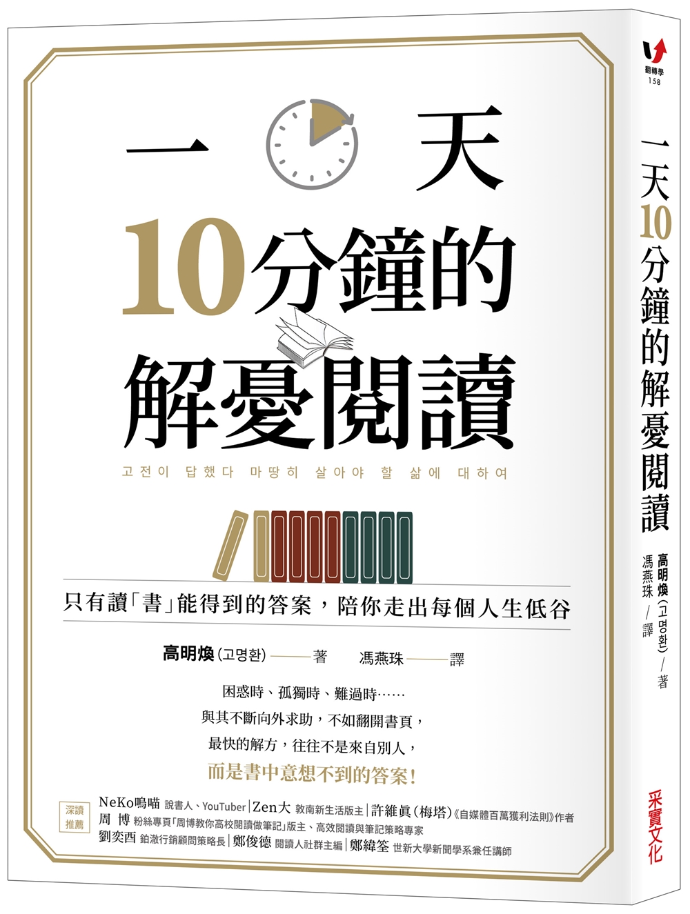 各界推薦 【深讀推薦】NeKo嗚喵|說書人、YouTuberZen大|敦南新生活版主 周博|粉絲專頁「周博教你高校閱讀做筆記」版主、高效閱讀與筆記策略專家許維真(梅塔)|《自媒體百萬獲利法則》作者劉奕酉|鉑澈行銷顧問策略長鄭俊德|閱讀人社群主編 鄭緯筌|世新大學新聞學系兼任講師「每個人都會有低潮與疑惑的時刻。這本書提醒我們,閱讀除了可以吸收知識,更是與自己對話的過程。每天10分鐘,讓文字成為生活中最溫柔的解憂力量。」──周博,粉絲專頁「周博教你高校閱讀做筆記」版主、高效閱讀與筆記策略專家 「閱讀青春時期不太快樂的我最推薦的治療,謝謝這本書讓我有接住擁抱感,甚是療癒。」──許維真(梅塔),《自媒體百萬獲利法則》作者「那個你迫切尋找的『解方』,一直在你的內心深處。書本是那把溫柔鑰匙,替你打開了通往內在智慧的門。」──鄭俊德,閱讀人社群主編 「在浮躁的年代,這樣一本書像是為心靈設下的慢讀避難所。你不用一次看完,只需在困惑時翻開書頁,經典會替你照亮那段路。我讀完的當下,腦中立刻浮現幾本塵封已久的書——那是我曾經熱愛卻疏遠的老夥伴。這本書不只是閱讀指南,更是一場與自己重新連線的邀請。推薦給那些覺得疲倦、覺得世界太吵的人。在經典裡,你會再次找到力量、方向,還有那個不會被時代風暴吞沒的自己。」──鄭緯筌,世新大學新聞學系兼任講師