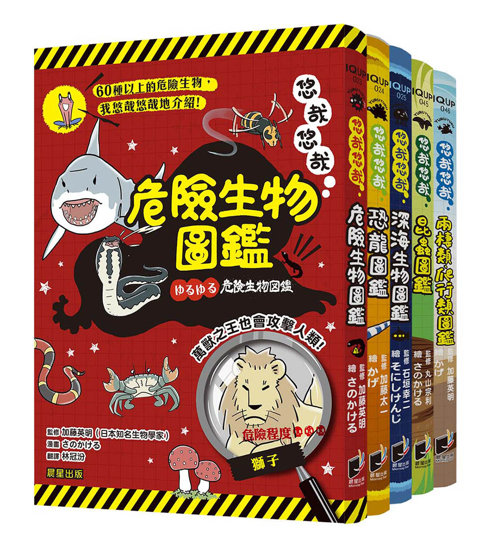 內容簡介 《悠哉悠哉圖鑑》五書合輯,一次收藏地球的奇幻生物奧秘!一次收齊 「危險生物」「恐龍」「深海生物」「昆蟲」與「兩棲爬行類」 五大主題圖鑑!地球是個充滿生命力的星球,從原始叢林,演變到現在更多元的沙漠山林、海底到我們腳邊的草叢,每一種生物都有其驚人的生存能力與獨特技能。《悠哉悠哉圖鑑》系列用生動有趣的風格、豐富的彩圖與四格漫畫,帶你輕鬆理解大自然中的奇異生物,深入淺出成為生物探險王!套書五本精華一次看:《危險生物圖鑑》獅子、老虎、毒蛇……這些讓人心跳加快的致命動物,但也是努力求生的強大生物。了解牠們的攻擊方式、警戒姿勢與棲息習性,學會與自然和平共處。《恐龍圖鑑》穿越時空回到中生代,認識恐龍家族的各種霸主與草食巨獸!飛行、游泳、奔馳的恐龍與古生物們,竟與現代鳥類有著深厚的關係?《深海生物圖鑑》進入黑暗神秘的深海世界,見識那些宛如怪物的生物造型。從會發光的水母到寄生型鮟鱇魚,牠們每一種都是極端環境下的進化奇蹟。《昆蟲圖鑑》走進昆蟲的小宇宙!從蜻蜓、螳螂到犀牛蟑螂,這些日常常見或意想不到的昆蟲,個個身懷絕技:飛行、偽裝、發光、跳躍…昆蟲界的奧運開賽啦!《兩棲類、爬行類圖鑑》水陸雙棲的忍者們登場!探索青蛙、蜥蜴、龜類的奇特演化與求生技巧。從性別決定的機制,到成為超人氣寵物的祕密,全都在這本裡!《悠哉悠哉系列》 套書特色:總計超過 300 種以上生物全彩圖解介紹,每種生物都搭配生動的四格漫畫,輕鬆吸收平常沒接觸的生物知識,補充專欄也不要錯過!趣聞、冷知識、注意事項一次了解,讓大小讀者都能愛上自然,從閱讀出發建立對生命的理解與尊重,跟著書中裡的「小導遊」,一起展開不同領域的知識探險!