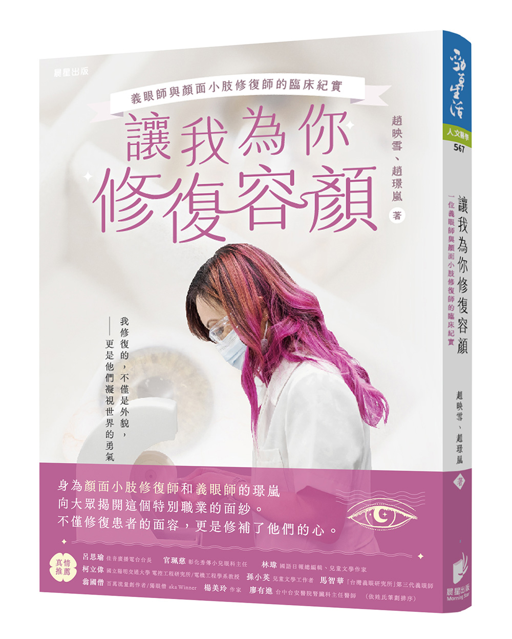很高興映雪和璟嵐能將這個小眾行業,透過書寫,介紹給讀者,而晨星出版社更是慧眼獨具,願意將這本書編印成冊。但願這本書的出版,能讓更多人了解到在醫界有義眼師和顏面小肢修復師這個行業,並且在必要時,不論家人或自己都能夠知道如何尋求幫助。