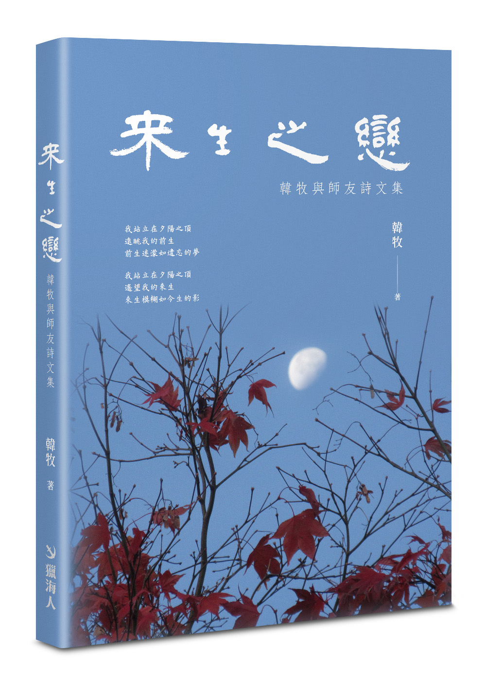 此書全名為《來生之戀:韓牧與師友詩文集》。書名題字是我寫的隸書。封面照片也是我拍攝,是白晝時的紅楓白月。封底的作者相片是文友李敏儀攝,於2025 新書發佈會上。