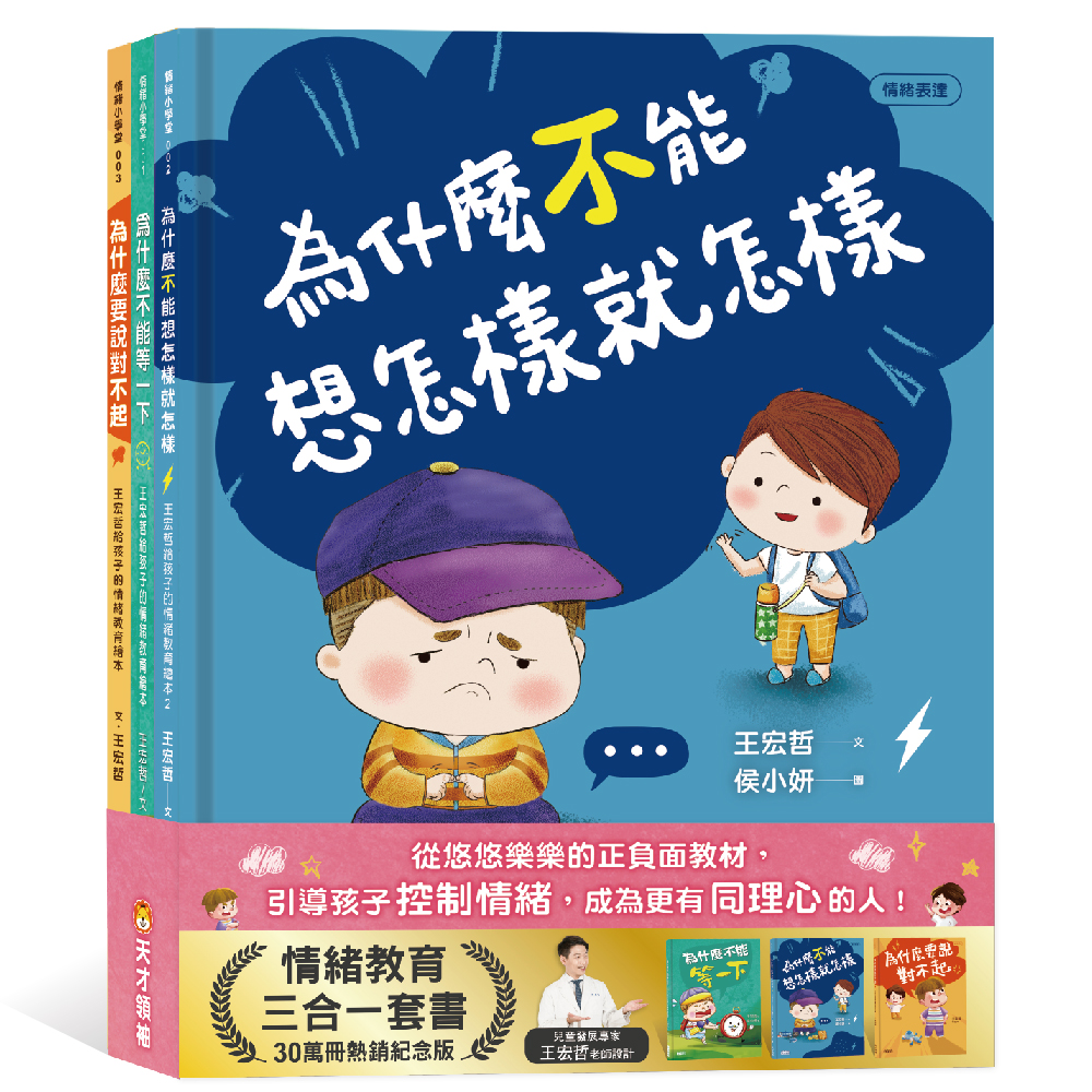 內容簡介 王宏哲老師的三合一情緒教育套書30萬冊熱銷紀念版跟著悠悠樂樂的正負面教材,引導孩子控制情緒,學習同理他人的感受!★隨書附:「親子溝通練習簿」+「手繪情緒卡套組」【1】《為什麼不能等一下》孩子很愛說等一下嗎?原來,孩子無法自動自發是有原因的......獨特雙情境繪本,帶孩子了解「自律」和「拖延」悠悠是個愛說「等一下」的小男孩,媽媽叫他吃飯,他就說「等一下」,叫他洗澡也說「等一下」,他覺得等一下哪有什麼關係!直到有一天,他發現「等一下」是一件很可怕的事……【2】《為什麼不能想怎樣就怎樣》孩子常常講不聽嗎?其實孩子聽不進大人的話都是有原因的……獨特雙情境設計,教出孩子「自律」及「情緒表達」「哼!為什麼小孩都要聽你們大人的規定?」悠悠是一個什麼都想照自己意思做的孩子,他常覺得大人管東管西很煩,直到有一天,他才發現不能「想怎樣就怎樣」......【3】《為什麼要說對不起》孩子犯錯為何不肯說對不起?是不認錯?還是缺乏勇氣?雙情境故事,教出「同理心」與「反省能力」悠悠是一個主見很強的孩子,他常常覺得自己都是對的,不想聽爸媽的話,而且他常常犯錯後都不說對不起。有一天,他做了一件讓媽媽很傷心的事,於是他決定要改變自己......◆ 系列特色:1、套書內容包含:3本繪本《為什麼不能等一下》、《為什麼不能想怎樣就怎樣》、《為什麼要說對不起》,隨書附「親子溝通練習簿」+「手繪情緒卡套組」!2、獨特雙情境故事:貼近學校與家庭生活的雙主線故事,幫助孩子學習自律、反省、情緒表達與同理心!3、情緒教育Q&A:每本繪本特別設計「情緒教育互動問題」,教父母如何引導孩子思考表達,幫助孩子發展懂事的能力。 4、親子溝通練習簿:王宏哲老師親撰《溝通練習簿》,提供父母實用的教養指南與高效溝通技巧,教孩子跟情緒做朋友。