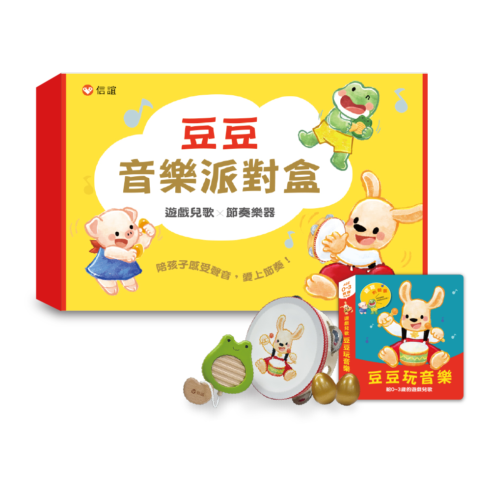 內容簡介 「豆豆音樂派對盒」,兒歌 × 樂器 × 遊戲,陪孩子感受聲音,愛上節奏獻給0∼3歲孩子的第一套音樂啟蒙禮物!「豆豆音樂派對盒」結合感官探索與節奏律動,是專為低幼孩子設計的第一套音樂啟蒙組合。盒中含有按壓的《豆豆玩音樂》有聲遊戲兒歌以及豆豆鈴鼓、青蛙刮板與雞蛋沙鈴三款好抓握的基礎節奏樂器,培養孩子的音感、節奏感與動作協調力。結合充滿律動節奏的遊戲兒歌,讓孩子和豆豆一起感受音樂節奏與律動的愉悅,自然而然的喜歡音樂、愛上音樂!《豆豆玩音樂——給0∼3歲的遊戲兒歌》——輕按感應點,琅琅上口的兒歌隨點隨聽、輕鬆跟唱!《豆豆玩音樂》寶寶有聲書共收錄了八首具備多樣化音樂元素的原創兒歌,旋律中巧妙融合了上行與下行(音高變化)、行進與停止、累進漸快、節奏律動與緊張點等特性,在充滿趣味與變化的樂曲中,培養孩子對音樂的感受力。再搭配貼近生活經驗、充滿童趣的歌詞,以及豆豆和好朋友們的可愛插畫,迅速吸引孩子們的目光,更強化了學習動機與情感連結。0~3歲的孩子愛唱歌,也愛玩遊戲。只要輕按書上感應點,兒歌就能隨點隨聽,讓孩子自主探索音樂的樂趣。而琅琅上口的遊戲兒歌,不僅幫助孩子累積字彙與句型,還能感受到語言的韻律與趣味。當孩子跟著音樂律動,或拿起樂器搖一搖、刮一刮,不僅加深了對詞意的理解,也提升了對音樂元素的敏銳度,並促進了感官體驗與動作協調性。※寶寶有聲書的特色:• 【圓角硬頁書】適合幼兒翻閱。• 【按壓式的音樂即刻點播】輕輕一按感應點,音樂隨點隨放!對於熱愛「自己來」的幼兒,自己按按鍵也是一大樂趣呢!• 【貼心的電池設計】撥動開關,可切換開啟或關閉音樂模式。使用電池供電,可輕鬆更換,方便孩子隨時開唱。豆豆鈴鼓.青蛙刮板.雞蛋沙鈴——當遊戲兒歌遇上節奏樂器,快來和音樂玩遊戲吧!對0~3歲的孩子來說,樂器就像是會發出聲音的玩具,因此,鈴鼓、刮板與沙鈴這類只需簡單操作就能發出樂音的節奏樂器,不但最容易上手,也有很好的互動性,是啟蒙樂器的首選。豆豆鈴鼓、阿呱刮板和雞蛋沙鈴是專為小小孩所設計的節奏樂器,好抓握、也容易操作。對孩子來說,只要搖一搖、敲一敲、刮一刮,就能發出美妙的樂音,這樣的過程既奇妙又充滿驚喜,會讓他沈浸在「製造音樂」的成就感與樂趣之中。雖然孩子一開始還無法準確掌握操作樂器與歌曲節奏的對應,但別忘了——玩得開心更重要!