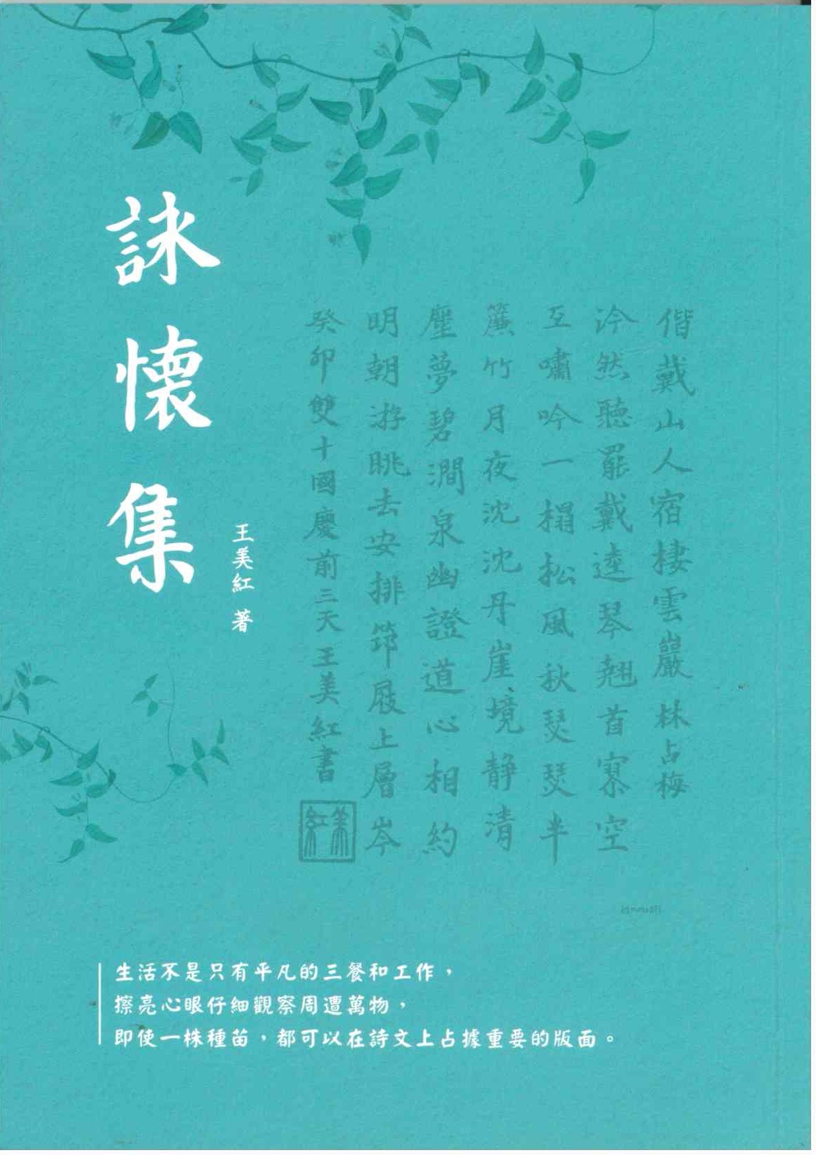 作者王美紅《詠懷集》乃二零一三起十年間的生活記詩。詩集分為五個篇章。壹、理想與現實的圓融契合。貳、自然與藝術的相互映襯。參、競合與重唱 ( 組詩 )。肆、有韻詩歌的昇華 。伍、( 類 )散文詩的試煉。詩的書寫也是生命情調的選擇,生活有所感所以有所詩。小自撫育女兒《女兒的成長》,大自閱讀《心經》以及一本書和居住的古城,都是以詩印證生活,引領讀者看見生活的款款深情。