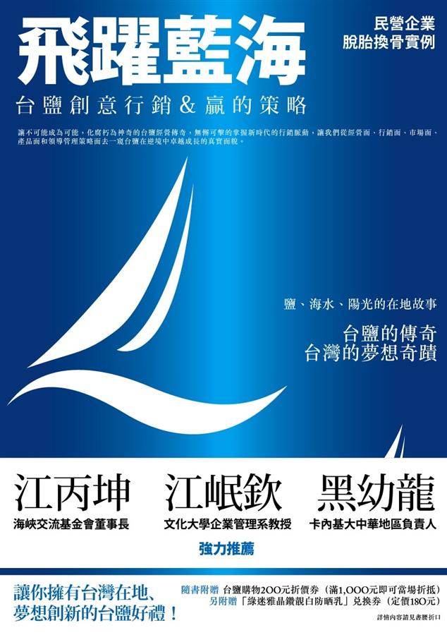內容簡介 面對動盪不安的經濟大環境,台鹽卻轉虧為盈,業績屢創新高,無可厚非,創意行銷已經讓台鹽完全脫胎換骨,成為台灣企業整合的絕佳典範,看台鹽如何在短短的時間內打敗不景氣並快速增加兩岸新契機,看台鹽如何飛躍藍海成為台灣品牌的表率。台鹽董事長洪璽曜以其獨特的經營哲學,帶領著台鹽團隊航向一片無限的商機藍海,在奠定品牌利基外,更成功地將台灣在地品牌發揚光大。本書以台鹽的創意行銷實例為出發,分享台鹽成功的小故事,董事長也是企管專家的洪璽曜更將傳授他個人獨創的領導管理心法。讓不可能成為可能,化腐朽為神奇的台鹽經營傳奇,無懈可擊的掌握新時代的行銷脈動,讓我們從經營面、行銷面、市場面、產品面和領導管策略面去一窺台鹽在逆境中卓越成長的真實面貌。鹽、海水、陽光的在地故事,台鹽的傳奇,台灣的夢想奇蹟。本書希望藉由結合不同的行銷作為,吸引年輕且非傳統政治熱衷者之讀者群,擴大此書的傳播面向。