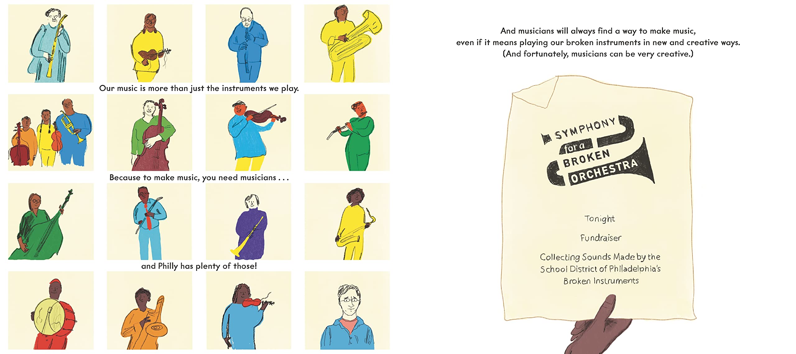 The schools of Philadelphia were filling up with broken violins, drums, pianos, and more, making it difficult for students to learn to play. This sparked an idea for a symphony, played entirely with the broken instruments, that would raise funds to repair the instruments themselves. Musicians young and old volunteered, and their captivating performance showed that even something broken can sing—and that great music is always possible with a bit of inventiveness and improvisation. Based on real events, this inspiring story introduces young readers to a range of instruments as it celebrates a community coming together to make a joyful, meaningful noise. More information about the nonprofit organization Broken Orchestra can be found in the back matter, including a link to an audio recording of the symphony performance.