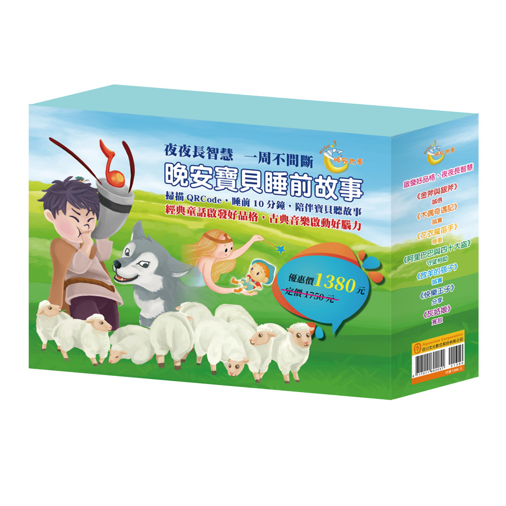 內容簡介 聽父母說故事是孩子的期盼,也是父母最大的享受,每天只要花10分鐘的睡前時間,與孩子一起分享故事內容,聆聽好聽的音樂;書內皆附有QRCODE可以掃描聽全故事及背景樂,每本背景樂各有一曲古典音樂,書底還有介紹創作的音樂大師,且讓你們了解背景音樂的來龍去脈。 陪伴孩子一起享受睡前的時光,就從今天開始! 【晚安故事】系列: 用童話啟發好品格 -- 精選寓意和趣味兼具的童話故事,潛移默化生活中的大道理,影響孩子一輩子的品格教育。親子睡前的親密對話,陪伴孩子在成長道路上,更堅定原本內心良善的信念。 用音樂啟動好腦力 -- 搭配古典音樂豐富的旋律,快慢有序的節奏,刺激聽覺神經生長與發育。音樂故事劇場身歷其境的感受,滿足幼兒的全腦發展刺激,是陪伴孩子的最佳床邊音樂故事! 《金斧與銀斧》 樵夫阿金的斧頭不小心掉到「仙女湖」裡了!因為他不受利誘的誠實品格,讓仙女不僅幫他把斧頭撿了回來,還送給他兩把珍貴的金斧頭和銀斧頭作為獎勵。另一個樵夫阿銀在旁邊偷看到了這一幕,也好想拿到那兩把珍貴的斧頭…… 《木偶奇遇記》 仙女用魔法讓薛貝特爺爺的小木偶皮諾丘會動、會說話,讓爺爺開心極了!但是皮諾丘在上學的途中,遇到了好多新鮮有趣的事情,一不小心就把「乖乖去上學」這個承諾忘得一乾二淨,還對來救他的仙女說謊,究竟會發生什麼可怕的事呢? 《花衣魔笛手》 哈梅爾鎮的居民總是亂丟垃圾,導致環境髒亂,老鼠滿街亂竄,卻只會互相指責。幸好一位神秘的吹笛人,將老鼠全部帶走了!可是沒有人懂得感恩,也沒有改變壞習慣,所以吹笛人氣得帶走了鎮上所有的小孩……。 等等,好像有兩個孩子沒有被帶走,他們有辦法幫居民把其他小孩救回來嗎? 《放羊的孩子》 明明沒有狼,但放羊的小安卻故意大聲吹響號角,欺騙大家「狼來了」,看著一群大人傻傻的跑來跑去,小安覺得好有趣喔!三番兩次被小安欺騙的村民漸漸的不再相信他了。等等,附近好像出現了奇怪的動物……。天啊!真的是狼來了! 《阿里巴巴與四十大盜》 「芝麻開門!」阿里巴巴來到強盜的山洞,發現裡面藏著好多的寶藏。這些強盜時常欺負鎮上的居民,搶奪大家的財物,真是可惡極了!阿里巴巴自願協助治安官,把這些強盜繩之以法。但是,強盜這麼多,他該怎麼做才好呢?他為什麼要從山洞中拿走金幣?這樣真的能對付強盜嗎? 《快樂王子》 迷路的燕子來到一個陌生的城鎮,陰錯陽差之下成為了快樂王子的助手。快樂王子在燕子的幫忙下,把身上的東西都送給了需要幫助的人,就連自己的一隻藍寶石眼睛也送出去了。天氣愈來愈冷,燕子得去南方過冬了,但她又不願意離開少了一隻眼的快樂王子。究竟該怎麼做,才能讓快樂王子恢復光明呢? 《灰姑娘》 失去雙親的灰姑娘,飽受壞繼母與兩位姐姐的欺凌,就連皇宮舉辦的舞會,她也沒辦法去參加。難過的灰姑娘正在院子洗衣服時,一位仙女出現了!仙女不僅替灰姑娘變出漂亮的衣裳,甚至還有華麗的馬車,不過,這些魔法到了十二點就會統統恢復原狀!究竟灰姑娘能不能趕在魔法消失前回到家呢?