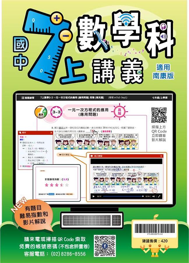 內容簡介 古云:開卷有益!就是說只要你打開書籍有心開始閱讀,久之,必有收穫! 如果你選對了書籍及其附帶有效的工具,將會讓你「事半功倍」! 漪欣數學講義,就是你在研讀數學時,最佳的書籍與工具(不是老王賣瓜)! 史上第一本每一題均附有詳細解說的講義,當你遇上困難時,本書會適時提供 影片解說及邏輯漸進式的文字解析,耐心地為你解惑!保證物超所值! 我們誠摯地想要教會你,就等你來使用!! 本書質優的特色 1. 每道題目均有漸進式邏輯推理的文字解析和老師解說。 (就像是將老師帶回家隨時耐心地循序教導你) 2. 功效顯著價格平民化,CP值特高。 (是紙本講義界的台積電) 3. 沒有附帶數十頁解答,各章節的答案可由QR Code立馬查閱。 (是最環保的講義)