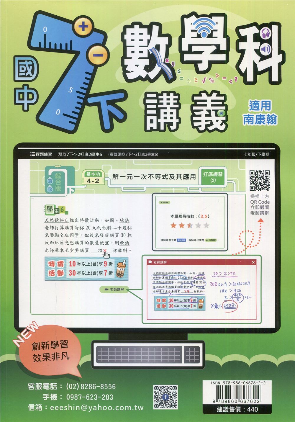 內容簡介 古云:開卷有益!就是說只要你打開書籍有心開始閱讀,久之,必有收穫! 如果你選對了書籍及其附帶有效的工具,將會讓你「事半功倍」! 漪欣數學講義,就是你在研讀數學時,最佳的書籍與工具(不是老王賣瓜)! 史上第一本每一題均附有詳細解說的講義,當你遇上困難時,本書會適時提供 影片解說及邏輯漸進式的文字解析,耐心地為你解惑!保證物超所值! 我們誠摯地想要教會你,就等你來使用!! 本書質優的特色 1. 題目有老師詳細講解,讓你易學易懂。 (就像是將老師帶回家隨時耐心地循序教導你) 2. 可掃描QR Code立馬觀看老師講解。 3.效果顯著、成績進步看得到;價格平民化,CP值特高。 (是紙本講義界的台積電)