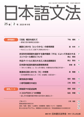 內容簡介 学会誌『日本語文法』25巻2号。下地理則 張未未 森山倭成 新山聖也 宮城信 森篤嗣 坂本瑞生 三宅俊浩 西畑宏紀 帖佐幸樹 学会誌『日本語文法』25巻2号。下地理則 張未未 森山倭成 新山聖也 宮城信 森篤嗣 坂本瑞生 三宅俊浩 西畑宏紀 帖佐幸樹