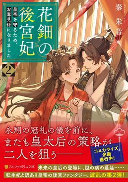 內容簡介 中華ファンタジー小説の世界に転生した黄明凛。毒を浄化する花鈿を活かして寵妃を装ったお毒見係として入内したのだが、皇太后の策略を退け、皇帝・青永翔と想いを通じ合わせた。しかし、永翔の冠礼の儀を前に、ついに未来の皇后・鄭玉蘭が登場!? 小説では皇太后に殺されるはずの彼女だが、どうやら皇太后との間に怪しい繋がりがあるらしい。更に市井では謎の病が蔓延し、お互いを守りたい永翔と明凛の気持ちはすれ違い――? 陰謀渦巻く後宮を生き抜く二人の恋物語、待望の第二弾! 前世の推しカプを見守るために後宮に入ったが、皇帝と結ばれた明凛。しかし、ついに小説内の未来の皇后が入内してきて――?