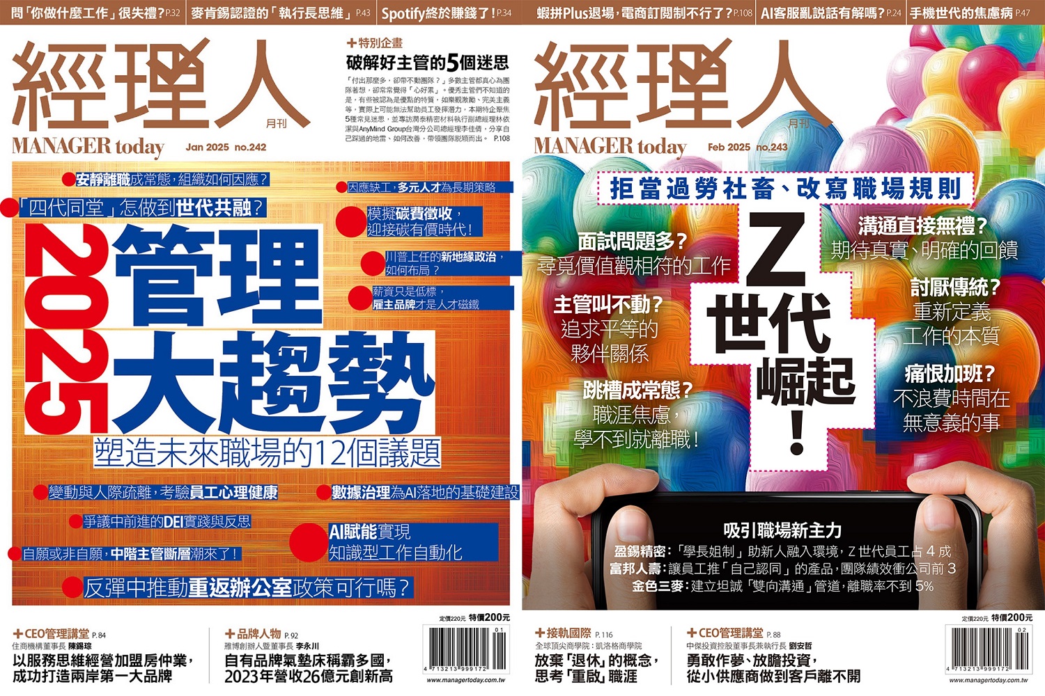 內容簡介 經理人月刊:2025.1月號2025管理大趨勢從2020年開始,全球每2年就遇到一次改變產業、商業環境的大變革。新冠疫情改變了人們的消費與工作習性、生成式AI的突飛猛進,也考驗著組織數位化程度、川普再次當選美國總統,也意味著各國關係將會有所改變,這些變動,都將持續影響全球。《經理人》採訪17位專家,整理12個重塑未來職場的管理趨勢,讓工作者與領導者都能洞察先機、做對決策。經理人月刊:2025.2月號Z世代崛起!最不想加班的世代來了!企業怎麼接招?2025年Z世代占全球勞動力的25%,而在台灣職場,有近2成是Z世代,從招募到留才,從溝通到管理,傳統的職場文化看似面臨挑戰。但,只要理解世代觀念差異,閱讀本期Z世代使用說明,就能讓年輕一代的工作者成為團隊最強戰力,為公司的轉型與創新注入新血。