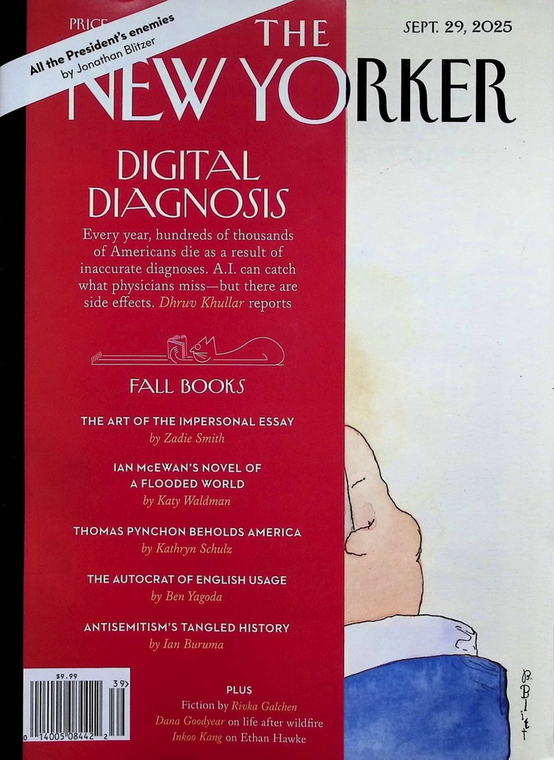 內容簡介 《The New Yorker》2025年9月29日號以「數位診斷」為封面主題,探討人工智慧在醫療診斷中的角色與風險。文章指出,AI雖能補足醫師的誤判、挽救生命,卻也可能帶來新的倫理與精準性問題。本期「秋季書籍特輯」收錄Zadie Smith論述散文藝術、Katy Waldman評析伊恩·麥克尤恩的洪水新作,以及Kathryn Schulz探討托馬斯·品欽筆下的美國意象。另有Ben Yagoda對英語使用權威的思辨、Ian Buruma剖析反猶歷史糾葛,以及多篇短篇小說與文化評論,共同呈現思想與文學的多重面貌。