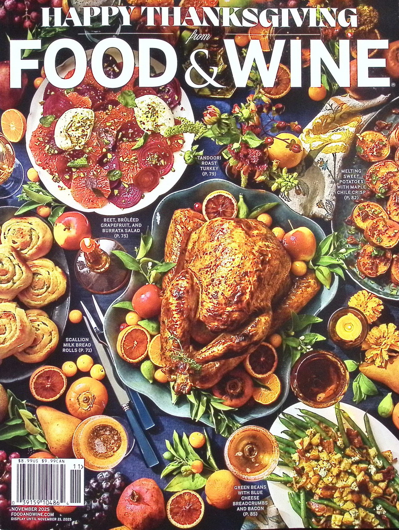 | 簡介 / | FOOD & WINE (Nov 2025):《Food&Wine》2025年11月號以「感恩節盛宴」為主題,呈現經典與創新並存的節慶料理。從坦都里烤火雞到甜薯辣椒砂鍋、青豆起司焗菜等佳餚,搭配誘 |