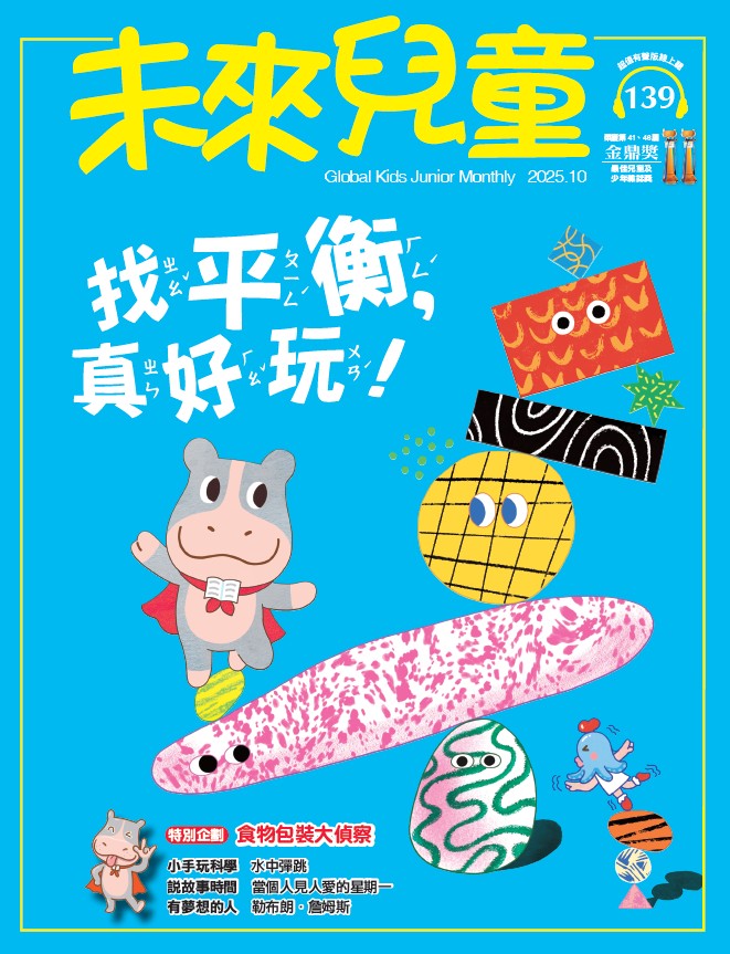 內容簡介 ★★★封面故事【找平衡,真好玩!】 你玩過翹翹板嗎?屁股用力往下一坐,即使另一邊是比你重很多的大人,也能把他高高舉起來!你還能讓翹翹板穩穩的撐著、不亂動,達到「平衡」嗎?說得出是怎麼辦到的呢? 為了揭開平衡的祕密,我們自己動手用鍋子、湯勺和透明盒,成功的在桌角,疊出一個歪斜、讓人感覺很不穩,卻平衡的裝置;並拍攝成照片,放在封面故事〈找平衡,真好玩〉的開頭,深入淺出的帶孩子探索,達成平衡的訣竅! 從隨手可玩的尺和橡皮擦的小實驗,發現「重量」要調到剛剛好的「位置」。從不倒翁、大頭公仔、玩疊疊樂,進一步感受重量與「重心」、「支點」的關係有多奇妙。當你理解怎麼找到平衡,學騎腳踏車就變得更容易了!小技巧是:腳踩哪一邊,身體就往反方向傾一點,讓腳踏車的重心,一直保持在兩個輪子支撐的範圍,就不會倒(讀完雜誌,可以去騎騎腳踏車,親身體驗那種感覺)。 我們還延伸探討藏在耳朵裡,讓身體保持平衡的「小小偵察兵」;解說臺北101大樓的阻尼球,怎麼減少超高建築物的搖晃程度;甚至像飛機在天上也需要保持平衡,才不會墜毀!最後,邀請你一起動動手,做出屬於自己的「平衡作品」,親身體會「平衡」的驚奇。原來科學這麼好玩又好用! ★★★特別企劃【食物包裝大偵察】 商店、超市的貨架上有滿滿的食物,包裝它們的方式也是五花八門——為什麼洋芋片的袋子要「裝」那麼多氣體,難道只是想看起來比較大包?仔細觀察,裝蔬菜的袋子,竟然打了好幾個洞,不怕掉出來嗎?還有,同樣是罐頭,有些是用玻璃瓶裝,有些卻是金屬容器,這又是為什麼?包裝就像是為食物「穿」上專屬的「防護衣」,讓食物能保持最新鮮、衛生與完整的狀態,送到我們手上,其中藏著許多智慧與創意哦,一起化身小偵探,跟著特別企畫〈食物包裝大偵察〉邊逛邊發現!★★★特別企劃【東北季風來嘍!】 從九、十月開始,經常能從氣象預報,聽到「東北季風」的資訊。為什麼它年年都在這時候來報到?如果問起住在臺灣北部和南部的人,對於東北季風的感受,肯定會得到很不一樣的答案:北部陰雨綿綿;南部則是乾燥無雨。同樣的風,為什麼會有這麼大的差異,又帶來什麼樣的影響?特別企劃〈東北季風來嘍!〉一一來解答。★★★自然故事「吉娜兒奇幻小劇場」:【獨立又勇敢的臺灣野兔】 可別以為這次小劇場的主角——臺灣野兔,和家裡的寵物兔沒什麼不同。看似柔弱,但生活在一千公尺山區的臺灣野兔,其實一出生就能站、能看,是個從小就學會獨立生活的山林小勇士呢!跟著「吉娜兒奇幻小劇場」,一起來看看臺灣野兔在山林裡,上演的勇氣故事吧。★★★超級大人物「有夢想的人」:【勒布朗‧詹姆斯】 〈有夢想的人:勒布朗.詹姆斯〉,以籃球巨星詹姆斯的成長故事為主軸,強調「冷靜是一種超能力」。詹姆斯的童年生活並不安定,卻在籃球與教練陪伴下,學會控制情緒、穩定心智。他在球場上冷靜分析、預先思考,帶領球隊逆轉勝,展現出領導力與智慧。 生動豐富又多元的內容,扎實好玩的遊戲設計,兼具解說的美麗插圖,還有線上音檔可以收聽,小朋友最有感的知識雜誌,就在《未來兒童》10月號。