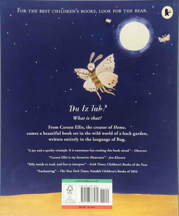 From the creator of Home, comes a book written in "Bug ".In her follow-up to the internationally acclaimed Home, Carson Ellis invites readers to imagine the dramatic possibilities to be found in a garden, where insects talk their own mysterious language... With gorgeous, exquisitely-detailed illustration that will appear to children and art-lovers alike, and a wonderfully playful invented language, we soon find ourselves speaking "Bug " ... Du iz tak? What is that?