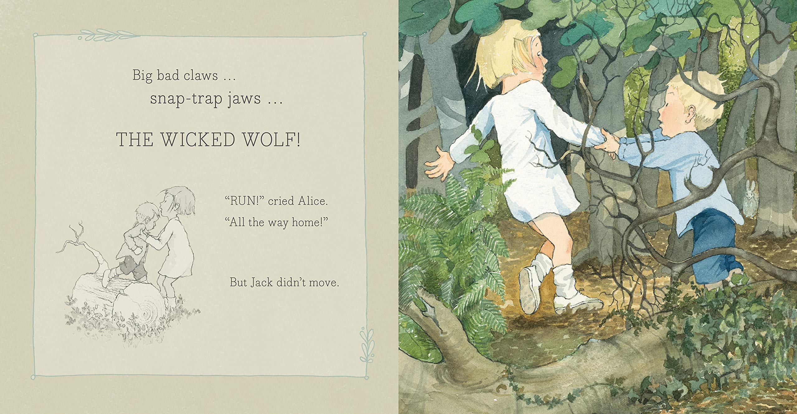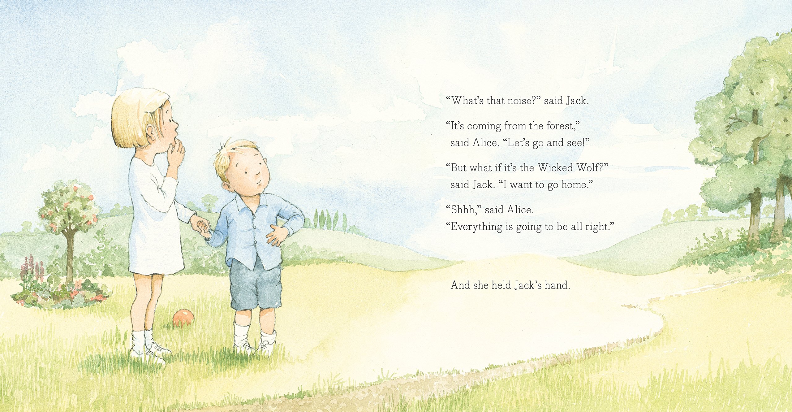 Helen Oxenbury 插畫Alice和Jack在院子玩傳球,聽到附近林野傳來奇怪聲音,Jack很想知道那是誰發出來的,Alice決定跟著去,一起作伴。可是愈走,Jack愈覺得害怕:如果是頑皮的狼怎麼辦? Alice 安慰著應該沒事的。愈往森林深處去,這聲音愈清楚,Jack更害怕了,萬一野狼有大爪子怎麼辦?會不會吃人呢?