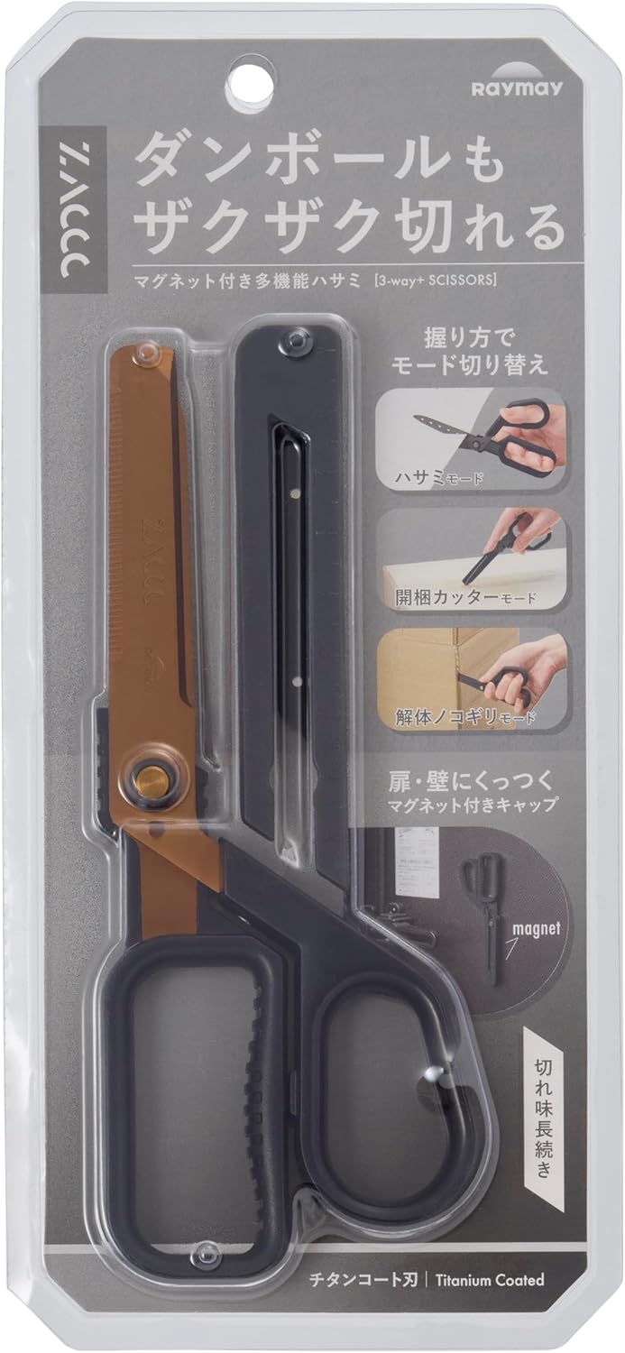 | 簡介 / | Raymay ZACCC附磁性蓋多功能剪刀 鈦金塗層:(防鏽刀片)1.開箱刀鋒,設計為安全且不易損壞內容物的長短。2.側邊鋸齒狀的刀片可用於拆箱切割紙板。3.安全蓋上附刻度,有助於 |