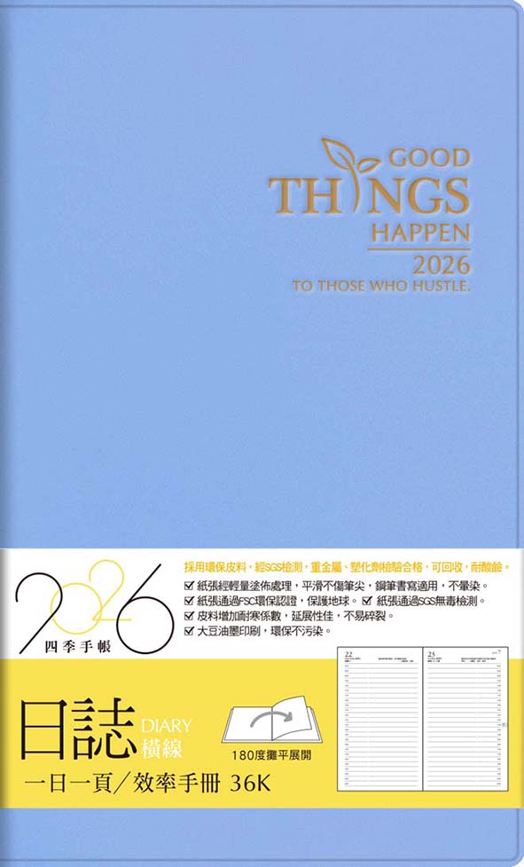 內容簡介 § 紙張經輕量塗佈處理,鋼筆書寫適用,不暈染,紙色柔順。§ 大豆油墨印刷,通過SGS檢測與FSC環保認證,一起愛地球。§ 皮料經SGS檢測,重金屬、塑化劑檢驗合格。§ 可180度攤平展開,雙頁書寫無礙。§ 規格:11.2x18.5x2.2cm,208張 416頁,75g,2種款式。§ 臺灣設計製造,品質有保障。商品規格尺寸:11.2x18.5x2.2cm,208張 416頁,75g材質:紙、塑膠(PVC)