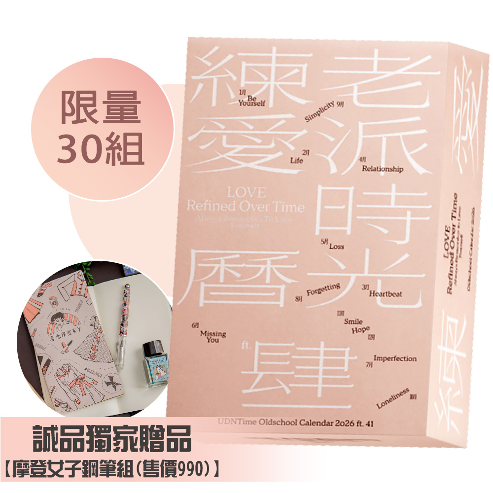 內容簡介 【2026老派時光練愛曆×肆一日日的溫柔陪伴】限量親簽鋼筆組肆一簽名版+贈摩登女子鋼筆組(原售價990),限量30本即刻入手珍藏,售完不補!心動、心跳與心傷……即使穿越了時空,「愛情」這門課題始終牽動人心,而人與人之間那種既緊密又親愛的關係,都是經歷爭執不安,溝通與磨合,甜苦酸鹹複雜感受交疊後,才能有屬於自己的答案。愛情不是生命的唯一,但有了愛,生活會更有滋味。愛情的真實樣貌,每個人的體會跟答案或許不盡相同,但在2026年可以跟著肆一的腳步,思考關於自我與情感,一日一句的溫暖金句,陪伴療癒365天。報時光的老派日曆,和肆一同探索恆久又經典的習題,讓我們一起在時光裡戀愛,也練愛!每個人生階段,愛情都會有不同的樣貌,所以並沒有標準答案;但可以確定的是,每一段相遇都有其意義,在經歷後也都會成為滋養自己的一部分。一直以來,肆一以清澈的視角,溫暖細膩的文字,直指情愛世界的掙扎與現實,不僅是深受歡迎的愛情作家,對許多人來說,也像是個給予能量的心靈導師。肆一說:任何關係的源頭,永遠都是「自己」。有的人會以為,所謂的「愛自己」是一種不顧他人,但其實它包含更多的是:你有能力能照顧好自己。當能真正地善待自己,就是開始幸福的時刻。☝️ 這不只是一本日曆,也是一份365天的陪伴練愛曆不僅是「戀愛」的諧音,也是一個「練習愛情」的意涵,每日的文字來自肆一累計暢銷百萬冊作品中,精選而出最受歡迎的超過300個愛情金句,易讀好懂,除了是具功能性的日曆外,也是一本輕閱讀感的日曆書。🩷☝️ 練愛曆從「愛自己」開始,每月搭配情境主題,肆一的每日一句,為你的生活加點鼓勵一年12個月,陪你一起12道愛的練習我們將一年12個月賦予12道練習,肆一分別寫了12篇新專文收錄其中;而設計師也為12個月各別設計了其代表的圖案,以簡約又富有變化的幾何圖形重組,象徵經歷與體驗,表現練愛過程中不斷地修正、試錯、不完美與不平衡動態心緒變化。肆一說:所有關係的源頭都是自己,每個人都是一個不規則的圓。☝️ 一本《練愛曆》,兩種心意:自我療癒,或是分享給他人的溫柔禮物特邀曾入圍葛萊美獎與金曲獎最佳專輯包裝設計,並為第30屆金曲獎「最佳專輯裝幀設計」得獎者,也曾獲Red-Dot德國紅點設計獎、DFA亞洲最具影響力設計大獎、台灣金點設計獎等獎項的資深設計師楊豐銘操刀日曆。《練愛曆》專屬訂製字體為表現舊時代氣息的美術風格,設計師特別量身打造了一組專屬日曆的訂製字體,結合肆一細膩的寬闊包容感,呈現老字新生的浪漫。每一天的溫柔粉與寧靜銀每月的最開始,從肆一為每月新寫的主題專文開始,接著是日日貼心的經典愛情金句與提醒。版面視覺構成疏朗有餘裕,柔雅的配色表現以杏粉、銀、灰、黑構成,特殊色印刷讓老報圖像展現另一種新風貌。 貼心設計 : 可以珍藏,也可以隨身攜帶精裝日曆盒採用工序繁複高成本的濕裱工法,觸感厚實又細膩。你可以將有感的文字日曆頁,撕下後貼在桌前,抬頭就能看見;輕薄的紙張,也可以撕下後折起,收納在皮夾內,時時守護你;或者是,可以將撕下的日曆收納在精裝盒裡,日後重複閱讀,成為時光禮物的一部分。🩷☝️ 獨一無二的特殊色印製精裝書盒,收納所有寫給自己的情書磁吸式設計輕鬆便利翻轉操作,輕鬆隨意置放生活與工作任一場域,不用拆解安裝,也更不容易打翻好擺放。輕鬆收藏一整年的愛與成長,一日一日慢慢翻頁,慢慢地更接近自己喜歡的模樣,練出愛的時光醇味。除了每日都保有隨時書寫心情的空間,特別在練愛曆的最後,留了數頁空白。這裡是可以自由書寫,紀錄當下的覺察與感受,成為專屬自己的練愛誌。可以是記錄不同心情的筆記,那些笑過、哭過、心動過的瞬間,都能見證自己一點一點的成長。報時光團隊海撈數萬張的老報復古圖像,經過時光的淬鍊,如何對應此刻找到最適切的設計與故事的轉化,一直是團隊的重要任務。2026日曆更著重與肆一暖句的相應,不僅要收斂切合主題性,更要推敲圖片與文字的情感密合度,反覆討論挑選。收錄來自1897-2010老報裡的副刊插圖,電影與產品廣告,經過細膩的設計構圖與局部裁切,特別採用灰銀色讓圖像更有時代攝影氛圍感。肆一說:我想不管在甚麼時代,愛情都是個共同的語言,只是表達方式不同,例如以前的人寫信或是登報徵婚徵友,因此留下許多愛情的見證,在這些老派的圖像裡,你會看到戀人之間,各式各樣的愛情樣貌。愛情的共感其實是跨越時空的,把這些老派的圖像跟我的文字放在一起,有一種既復古又新穎的感覺,我希望這些純粹以及真摯,能夠療癒到需要的人。穿越時空回到過去,老報裡的愛情是什麼模樣?1966年,台北市有新「伴」娘服務行業,冰果室喝杯水就有廉價愛情出租!1972年,新光人壽推出夫婦愛終身壽險!1971年,聲寶推出愛情洗衣機!一份以「愛」為名的報時光專刊報紙,報時光團隊撈取1930-1990年老報裡的新聞,企劃六大主題,舉凡徵婚徵友廣告欄,愛情解惑專欄,愛情趣聞,充滿愛情泡泡的各式產品廣告,還有濃濃情味的愛情電影廣告,一秒穿越時空,翻閱時代裡趣味又浪漫的愛戀故事,感受時代裡的練愛事。凡贊助日曆產品或特別日訂製書,就能享受老派讀報的懷舊趣味!