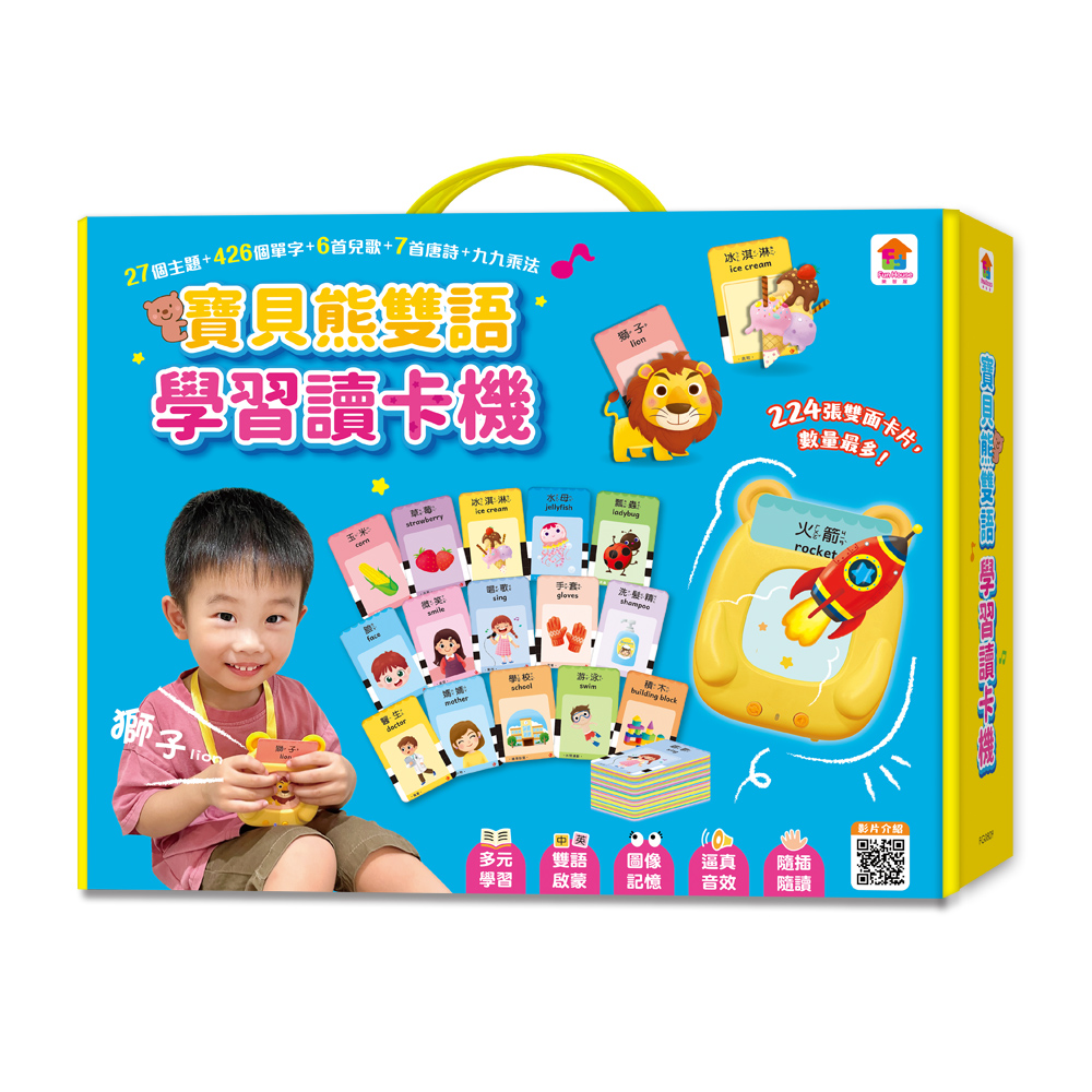 | 簡介 / | 寶貝熊雙語學習讀卡機:雙語啟蒙X多元學習X隨插隨讀★27個主題+426個單字+6首兒歌+7首唐詩+九九乘法★★內容物:寶貝熊讀卡機+224張雙面圖卡+吊繩+充電線。亮點1:多元主題 |