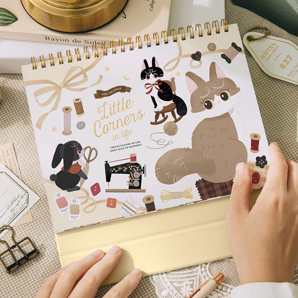 商品描述 | 2026 wwiinngg插畫桌曆 與你同日Little Corners in Life:尺寸21x16cm的2026插畫桌曆,封面及底座燙霧金點綴,搭配古銅金雙線圈,整體更有質感;內頁使用豐富手感的沐光紙 |