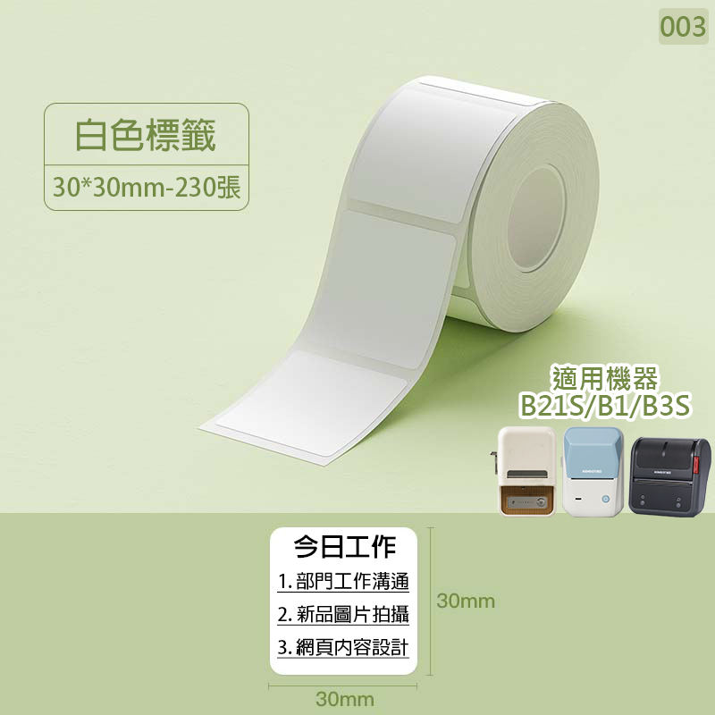 商品描述 | 精臣B系列標籤紙 白色 30*30mm:★精臣原廠標籤紙,適用於B21S/B1/B3S標籤機。★高品質紙張,不掉屑。★適用於價格標示、文書處理、姓名貼紙、警示標語、商品標示等不同應 |