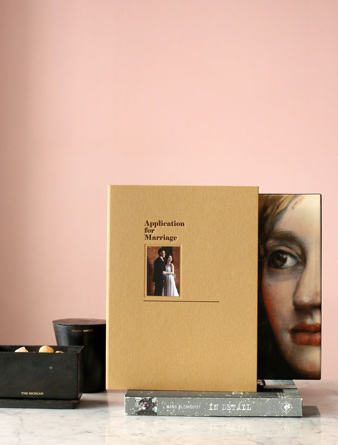 以褐色特殊紋理的紙張裱裝成精裝書的硬殼質感,封面燙上深咖箔字樣「APPLICATION FOR MARRIAGE」 。